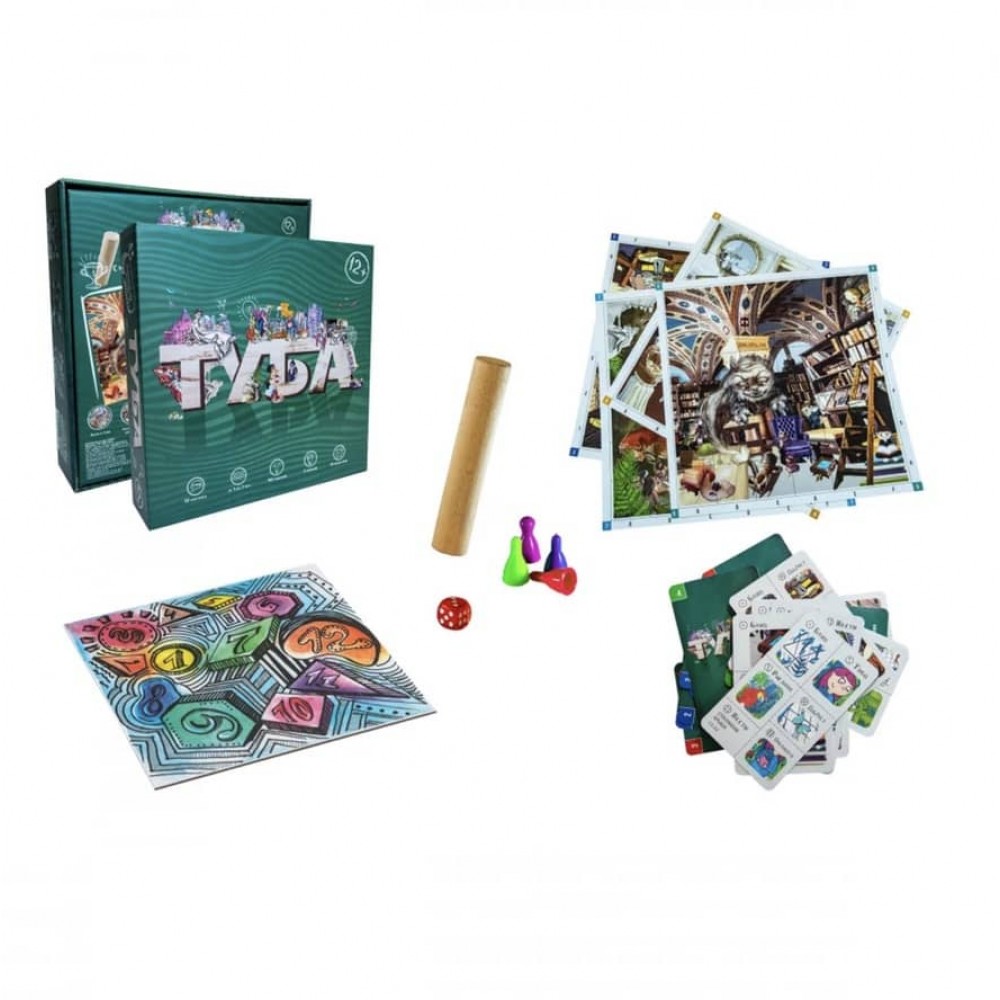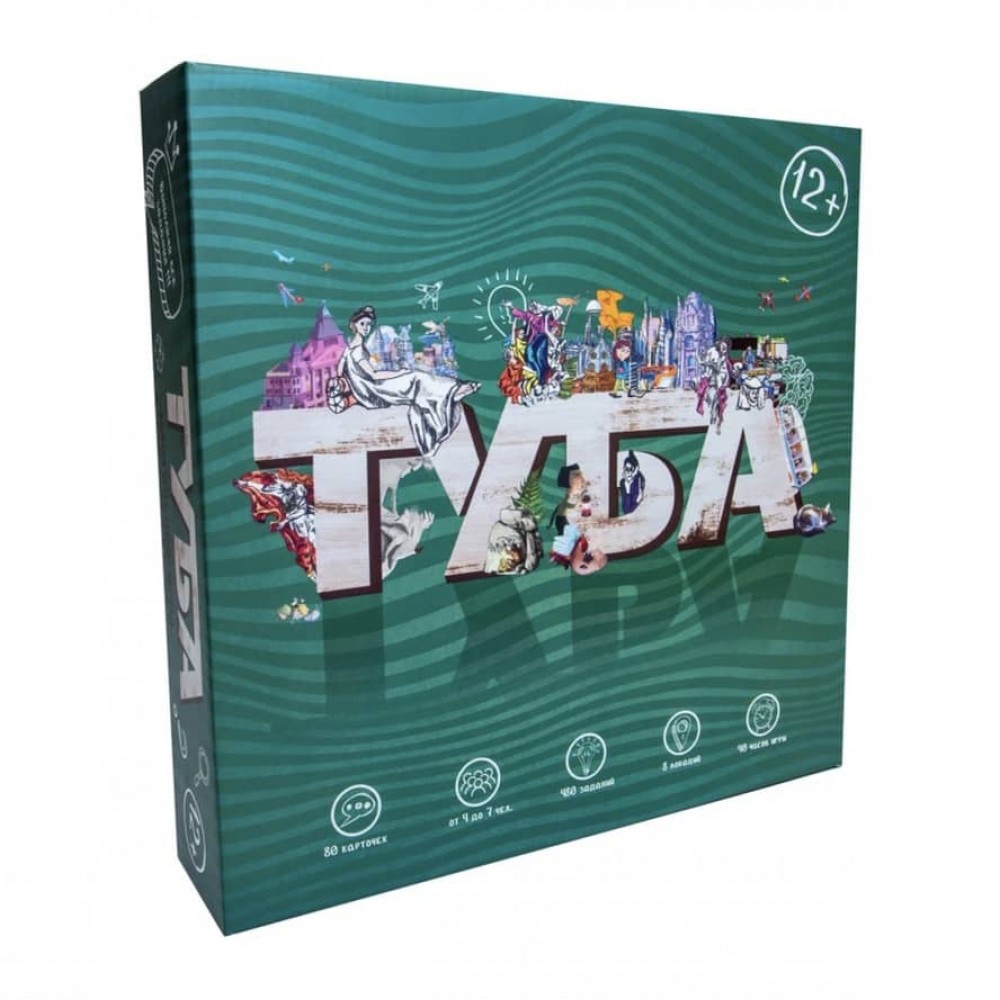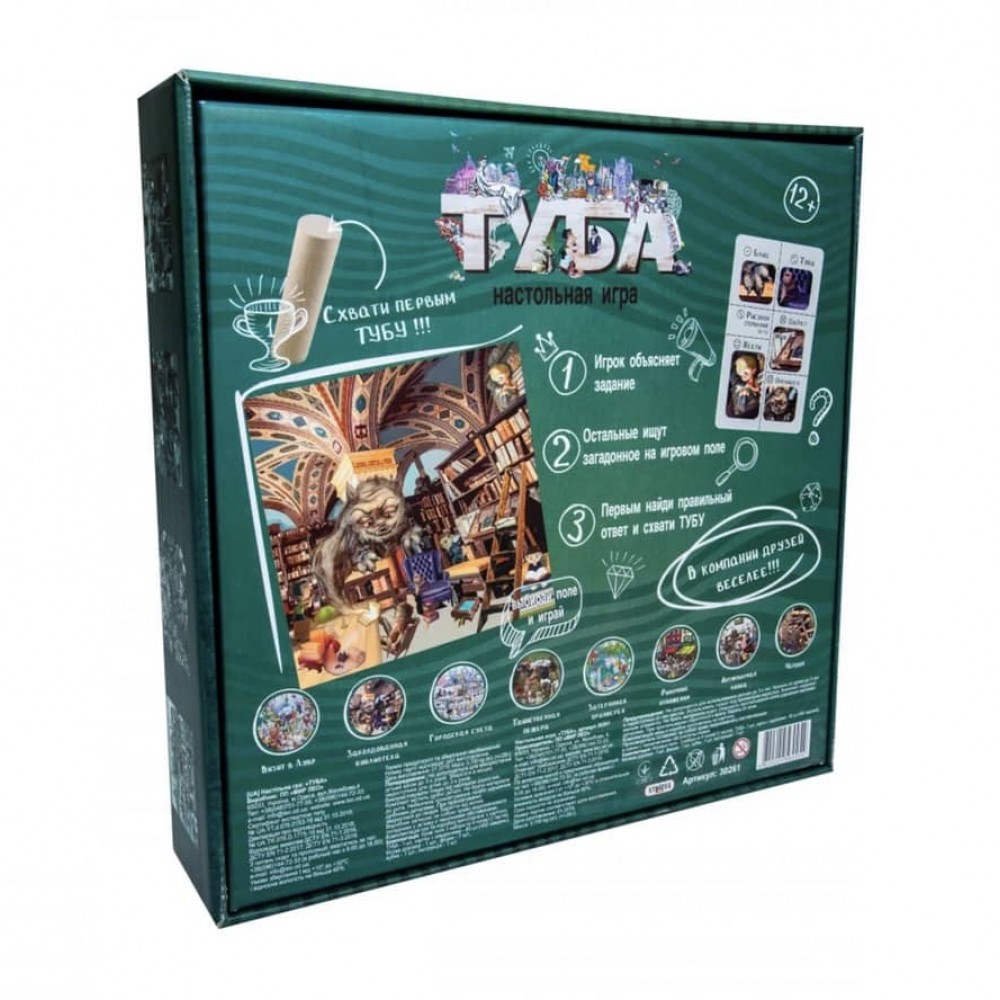 ♦ Комплект: 80 карток, 7 фішок, 12 ігрових полів, бігова доріжка, дерев'яна туба, кубик, інструкція.