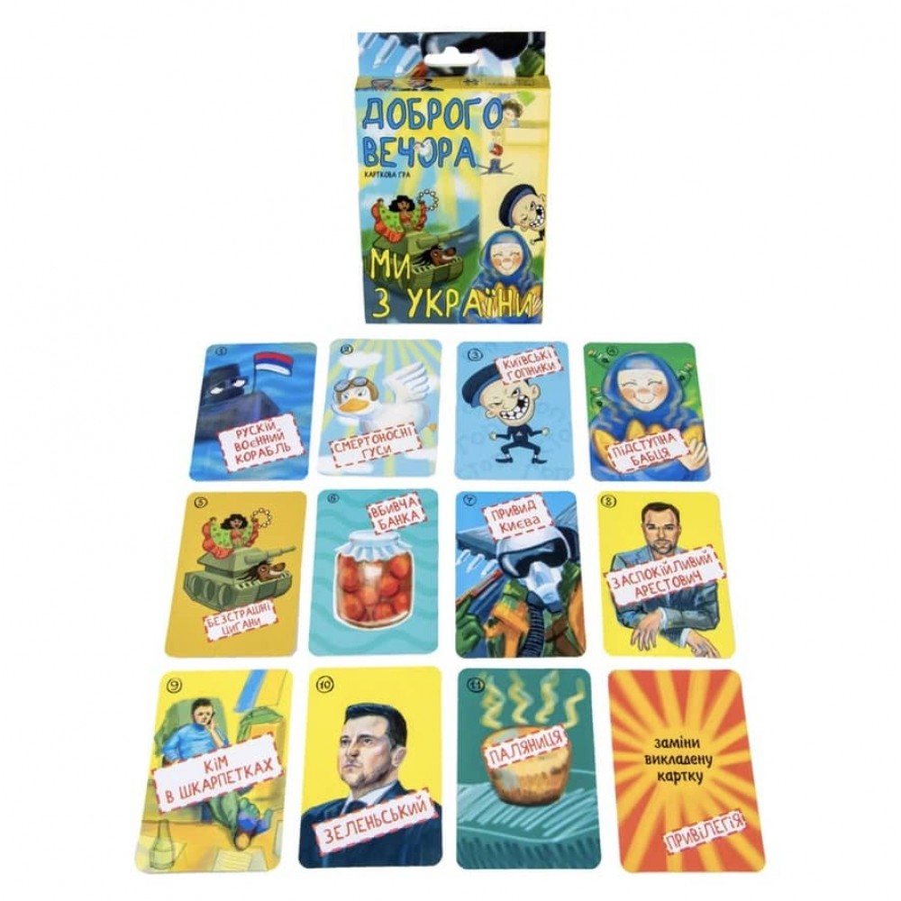 «Доброго вечора, ми з України» - карткова гра, в якій «київські гопники» та «безстрашні цигани» перемагають «рускій воєнний корабль», «заспокійливий Арестович» дійсно заспокоює, а кожен гравець може поставити крапку в раунді за допомогою «паляниці». Всім роздають картки відкритими, які потрібно швидко запам'ятати та перевернути. А далі гравці викладають по одній картці, намагаючись викласти таку, яка буде вище номіналом за картки суперників. Якщо вийшло – гравець забирає всі карти собі, а для перемоги потрібно зібрати якомога більше. Грати у «Доброго вечора, ми з України» Strateg (30371) дуже просто та весело, особливо, якщо ви справжні українці.