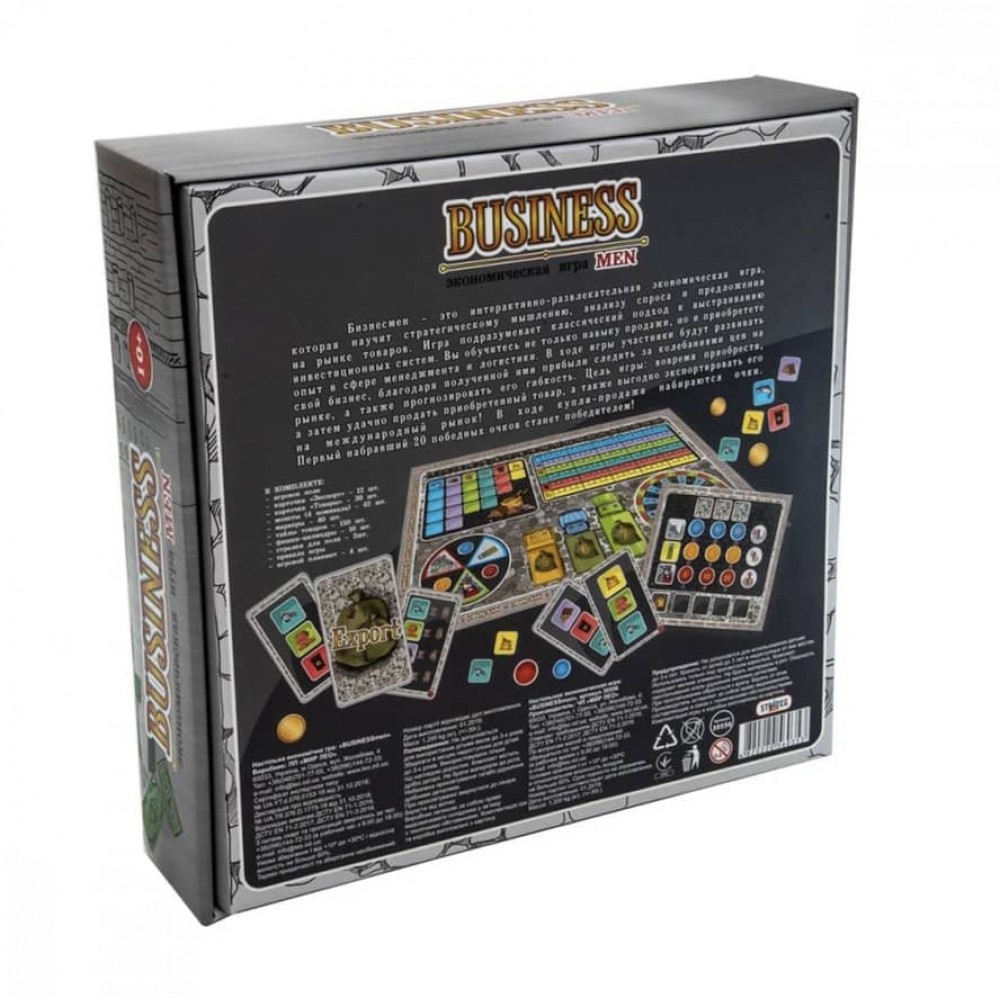 Настільна гра «BUSINESSmen» Strateg (30556) схожа на відому гру «Монополія», але відрізняється від неї. Тут учасники використовують товари для розвитку свого бізнесу, забезпечують купівлю, продаж, доставку та експортні операції. Інтерактивна розважально-навчальна гра познайомить з основами економіки капіталізму, навчить аналітиці, покращить стратегічне мислення та вміння передбачати наслідки своїх дій. Перед початком гри ознайомтеся з правилами, виберіть ігрові планшети, розділіть картки та валюту. Переможе найкмітливіший.