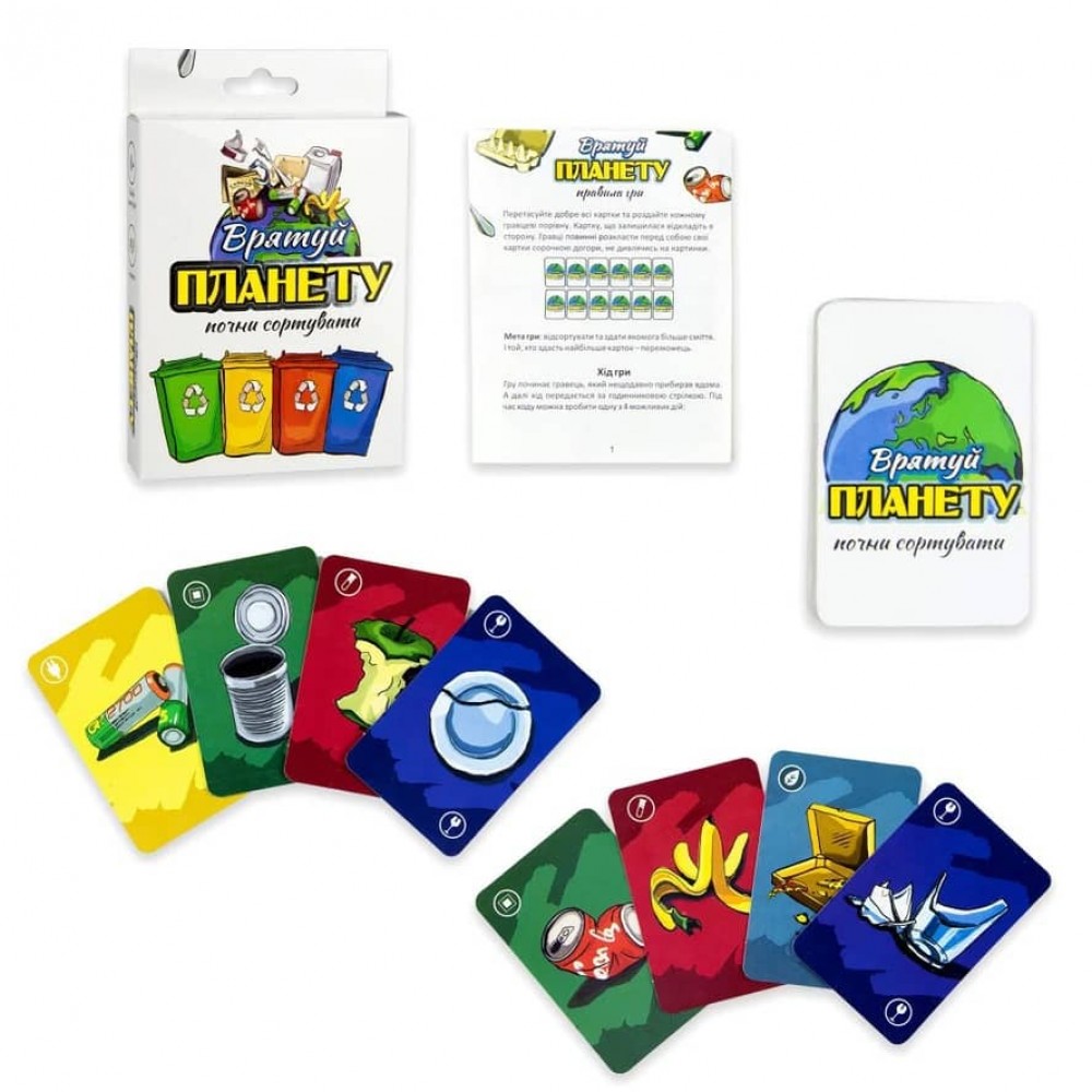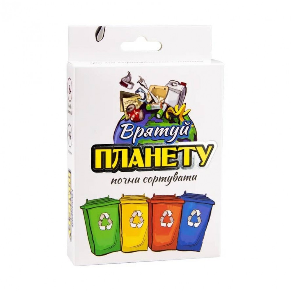 «Врятуй планету»– це гра в зручному форматі, яка складається з 49 карток. На кожній картці намальований предмет, який потрібно віднести до відповідної категорії та відсортувати, і чим більше ви зможете відсортувати, тим ближчі будете до звання переможця.