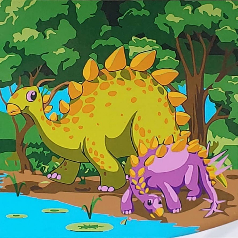 Картина за номерами Strateg ПРЕМІУМ Динозаври коло берега з лаком та з рівнем розміром 30х30 см, ES172