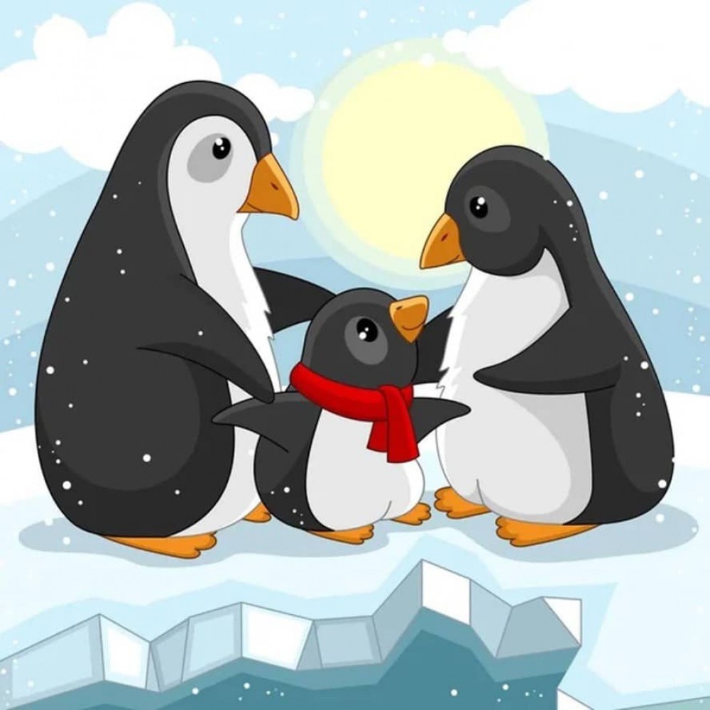 Картина за номерами Strateg ПРЕМІУМ Родина пингінів з лаком та з рівнем розміром 30х30 см, ES191