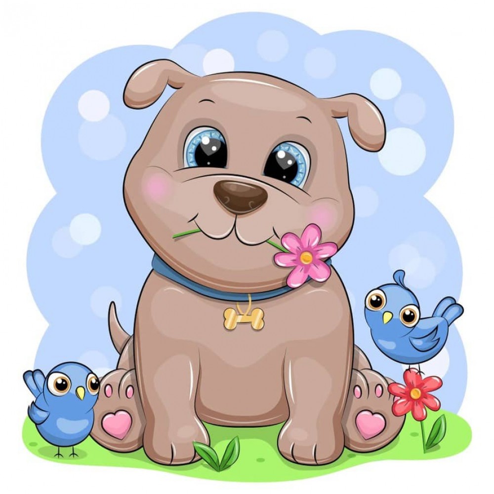 Картина за номерами Strateg ПРЕМІУМ Собаченя з птахами з лаком та з рівнем розміром 30х30 см, ES199