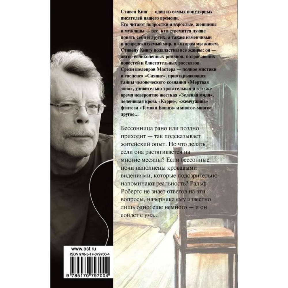 Головний герой роману «Безсоння» американського майстра психологічної прози Стівена Кінга — Ральф Робертс, «сивий вузькоплечий старий з великими руками, ще придатними до роботи». Після смерті дружини він впадає в болісне безсоння. Одночасно його приятель, молодий вчений Ед Діпно, раптом змінюється до невпізнання: б'є дружину, порушує закон і постійно виявляє агресію. Завдяки безсонню Ральф починає розуміти, у чому причина такої різкої трансформації.