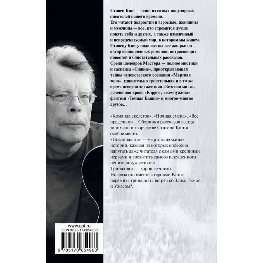 Збірка оповідань «Після заходу сонця» класика світового хорору Стівена Кінга була видана у 2008 році. До нього увійшли тринадцять містичних та психологічних творів. Серед них — «Вілла», «Гретель», «Сон Харві», «Стоянка», «Велотренажер», «Речі, що залишилися після них», «Після випускного», «Н.», «Кіт з пекла», « „Нью-Йорк таймс“ за спеціальною ціною», «Німий», «Аяна» та «На замку».