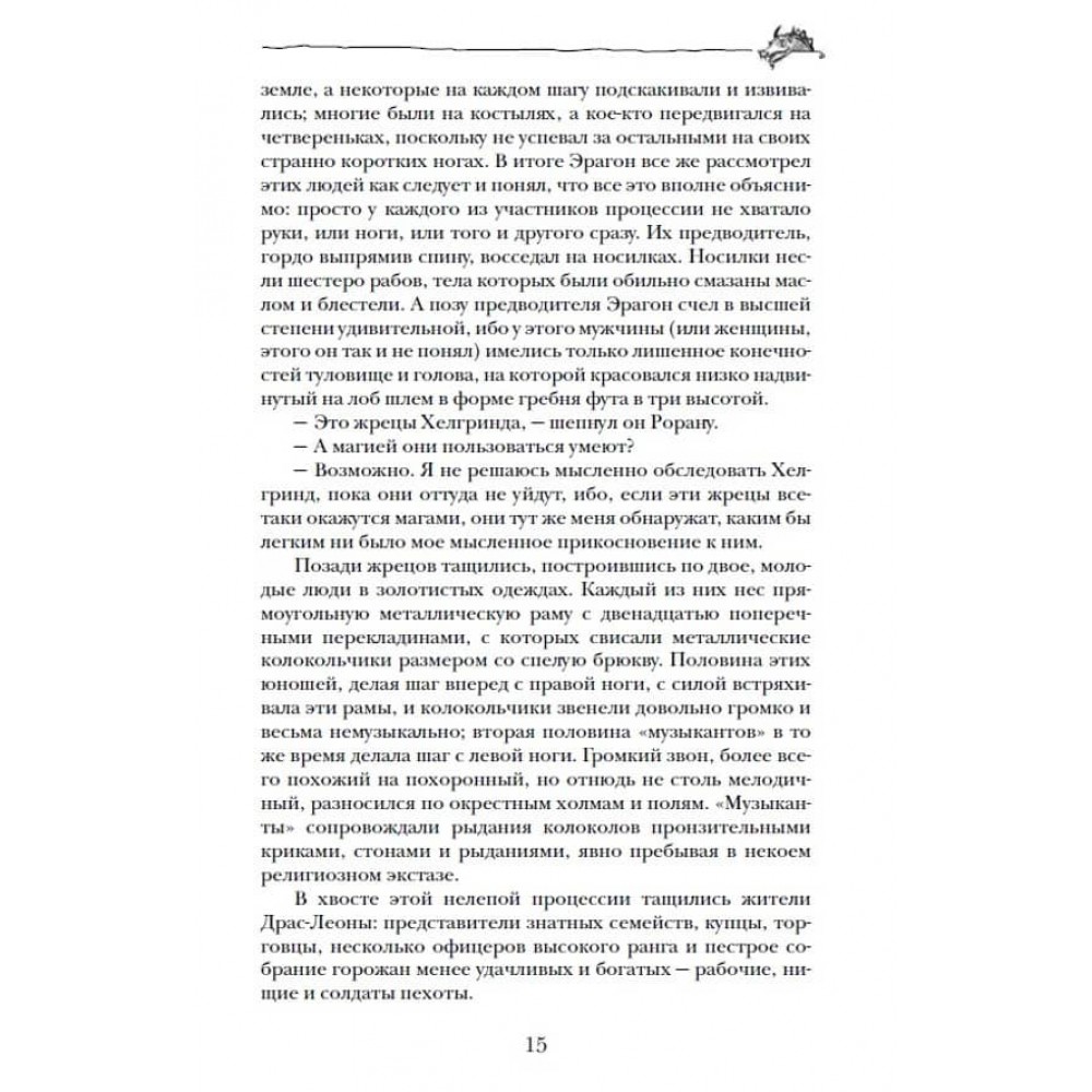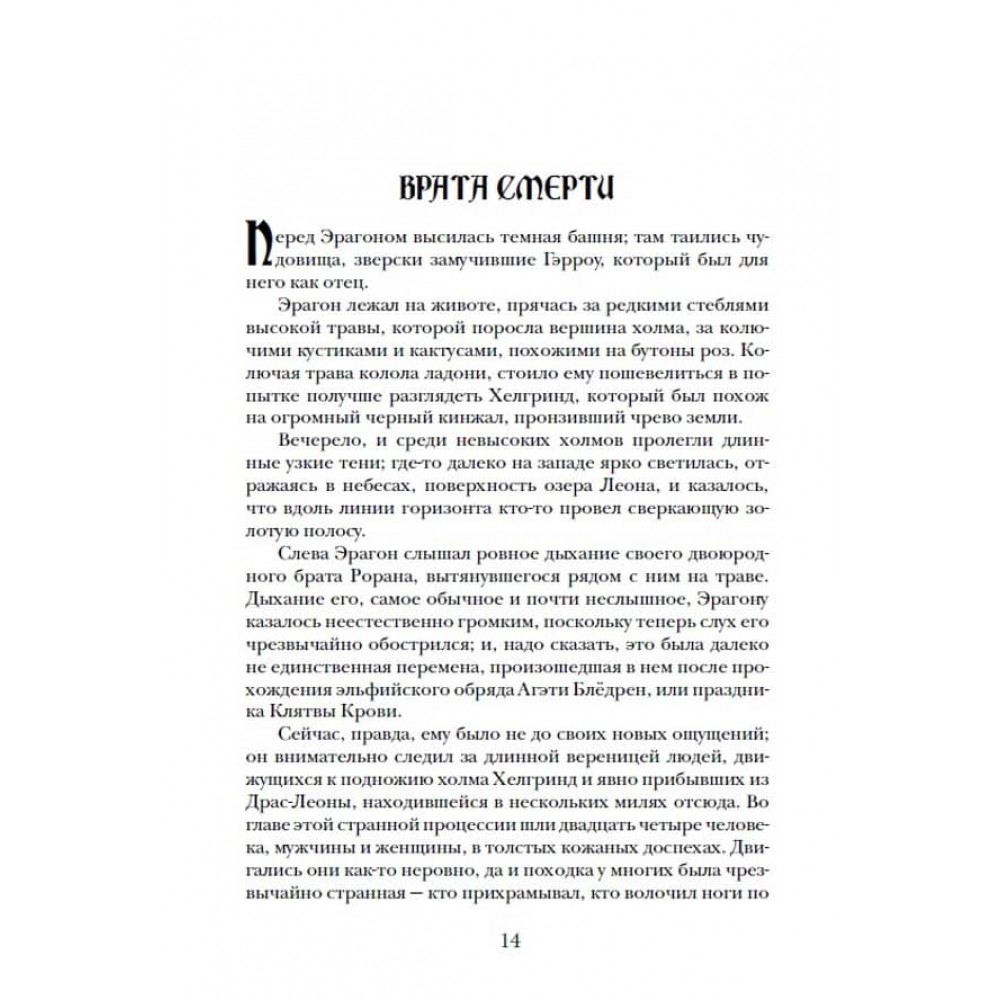 У третій книжці тетралогії Крістофера Паоліні "Спадщина" легендарний Вершник Ерагон продовжує битися з ургалами і раззаками, безмежно служити варденам і народові Алаґейзії та навчатися у гномів і ельфів. А в скрутну хвилину згадує поради свого наставника Брома. От тільки Бром, виявляється, не просто наставник... Таємницю цю до певного часу зберігала від Ерагона навіть вірна дракониха Сапфіра