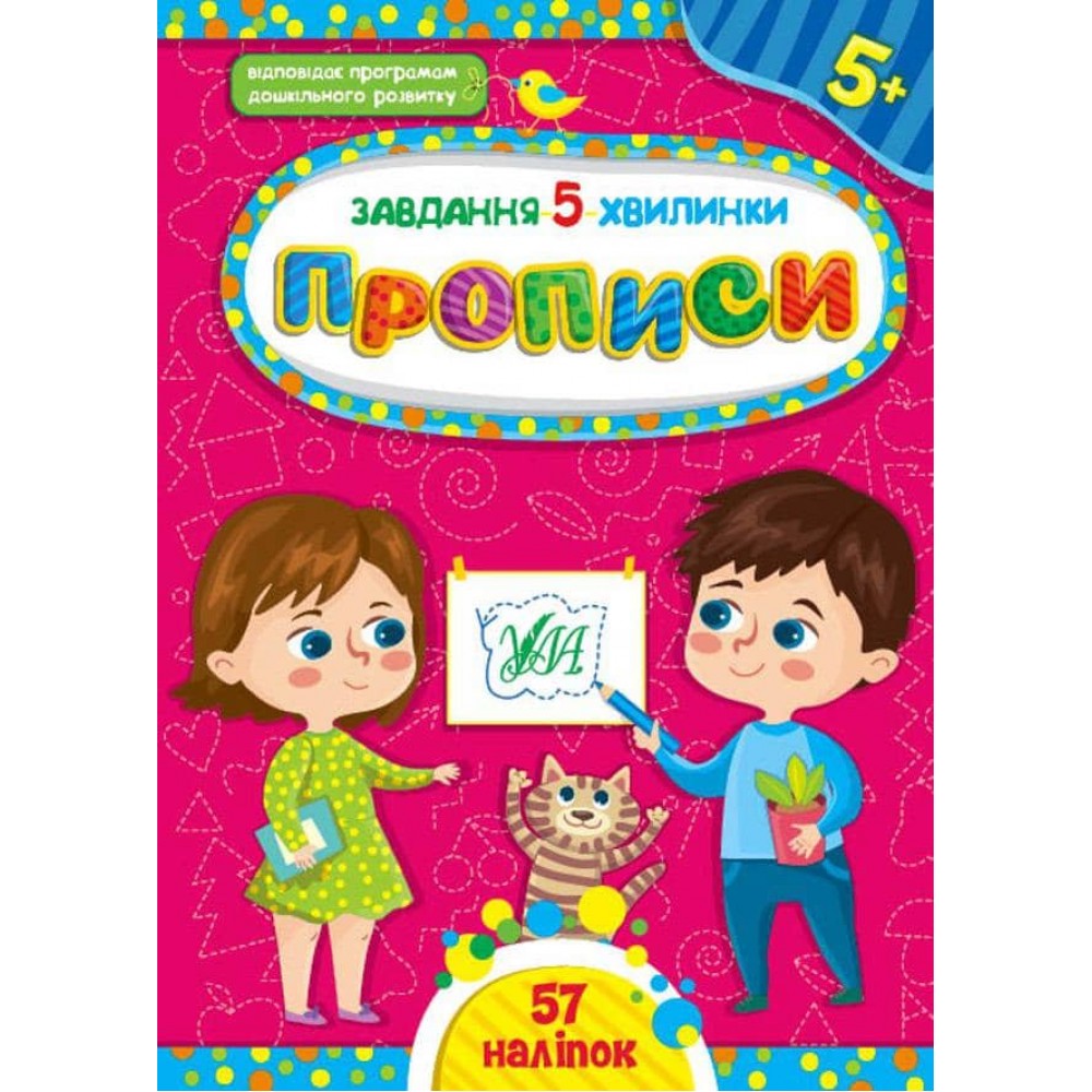 Книжка «Прописи. 5+» стане гарним помічником для вашого малюка під час розвитку дрібної моторики пальців рук, адже кожне завдання з прописів — це маленька захоплива пригода, уплетена в яскраву ілюстрацію. Тематичні наліпки доповнять й урізноманітнять роботу. Книжка спрямована на покращання мовленнєвих здібностей, пам’яті та уваги, а також на виховання врівноваженості й посидючості. Видання призначене для спільної роботи дорослих з дітьми віком від п’яти років.