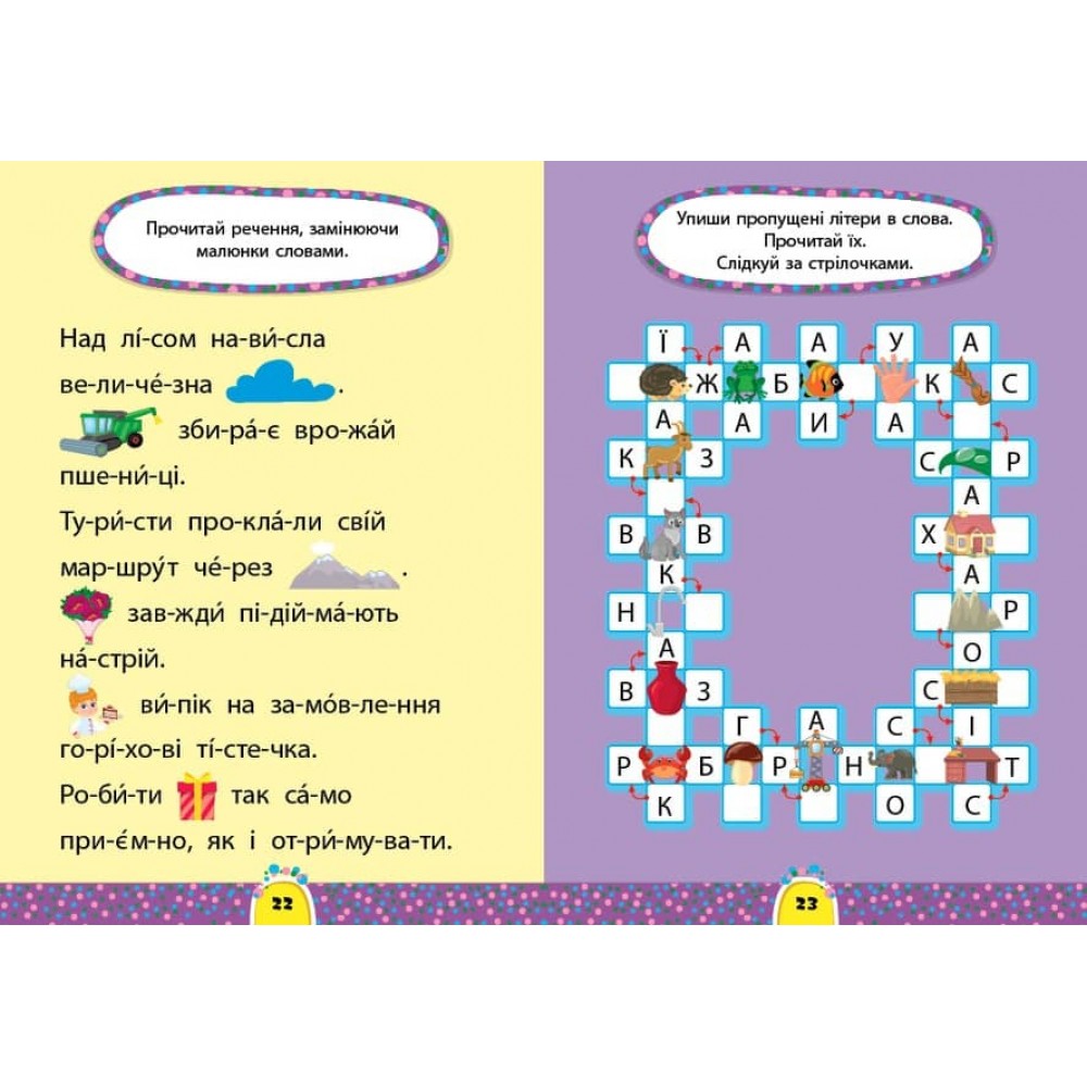 Книжка «Читання. 6+» допоможе дитині відпрацювати навички читання слів і перейти на наступний рівень — до читання словосполучень, речень і тексту. Тематичні ігрові завдання спонукатимуть уклеювати букви й склади в слова, визначати кількість складів, утворювати нові слова із поданих, розгадувати ребуси та кросворди, доповнювати прочитаний матеріал наліпками чи розповіддю. Видання призначене для спільної роботи дорослих з дітьми віком від шести років.