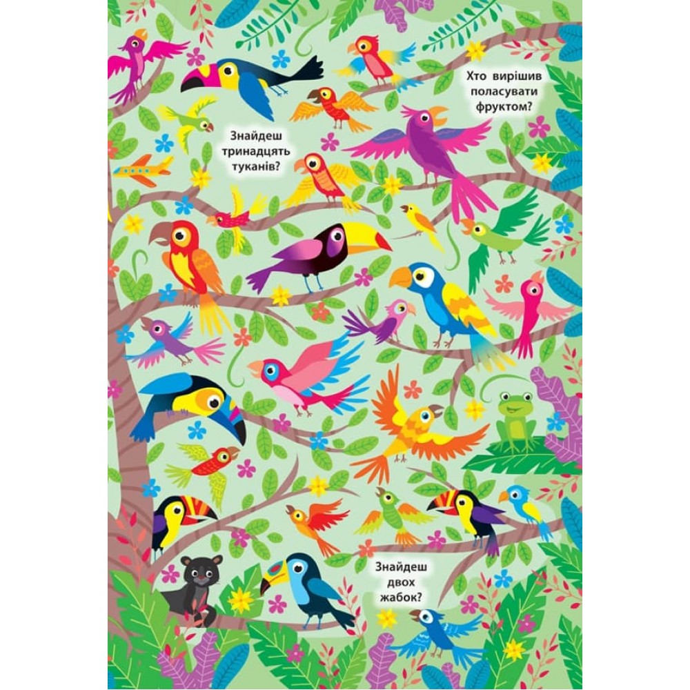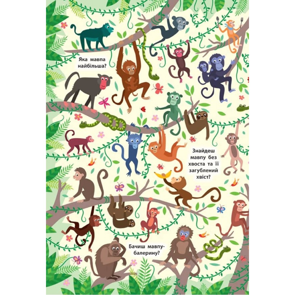 Це видання познайомить дитину з дивовижним світом джунглів. Виконуючи завдання, маленький розумник розвине уяву, потренує пам’ять та увагу, навчиться міркувати, творчо підходити до вирішення різних завдань і зможе відчути себе справжнім слідопитом! Кожен розворот книжки містить велику барвисту ілюстрацію з безліччю різноманітних кумедних персонажів і запитання, що підкажуть, які несподіванки потрібно шукати на картинці.