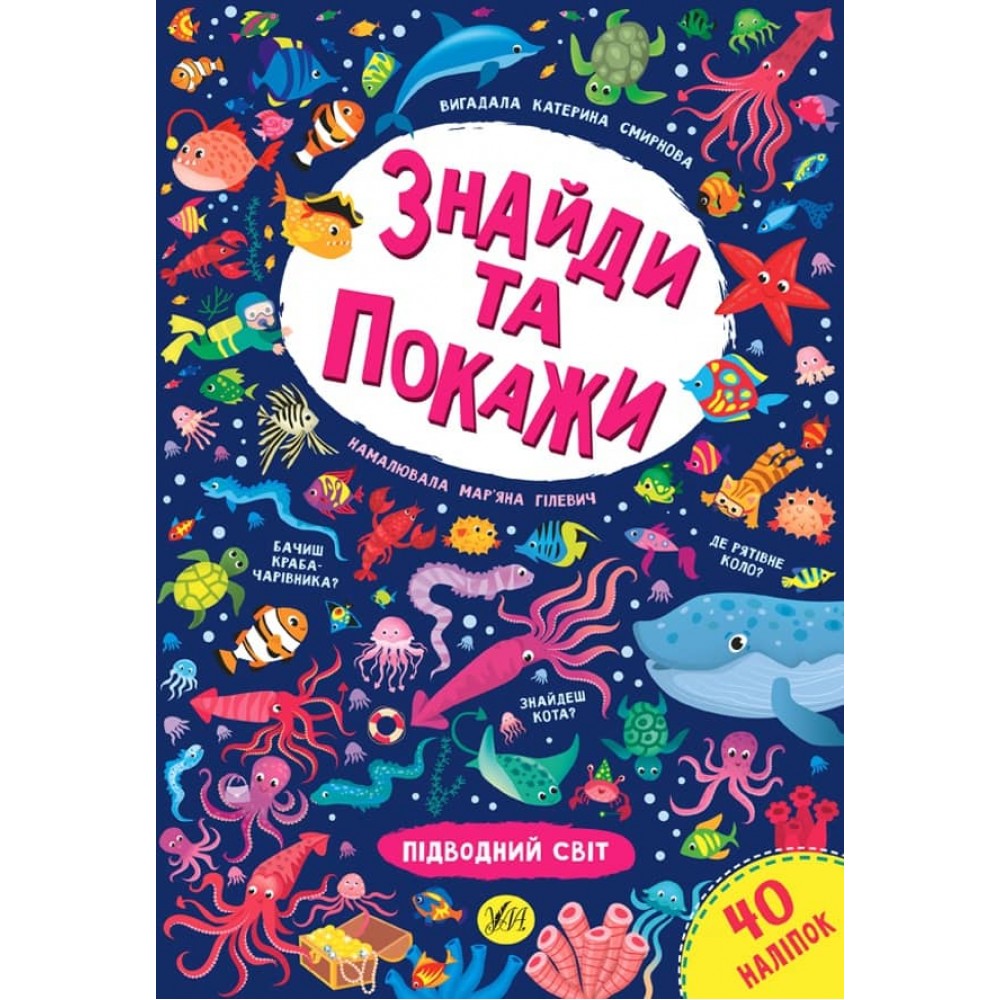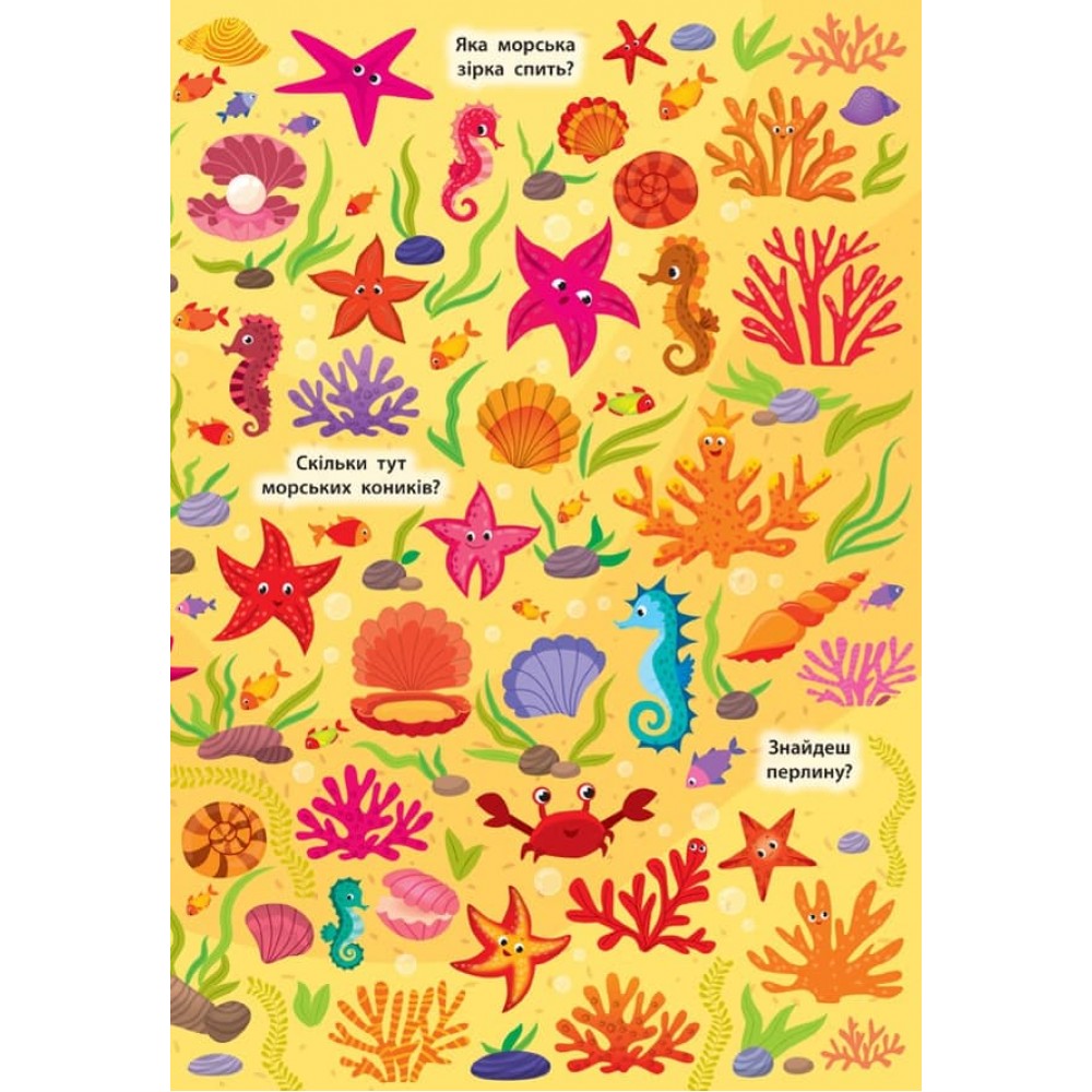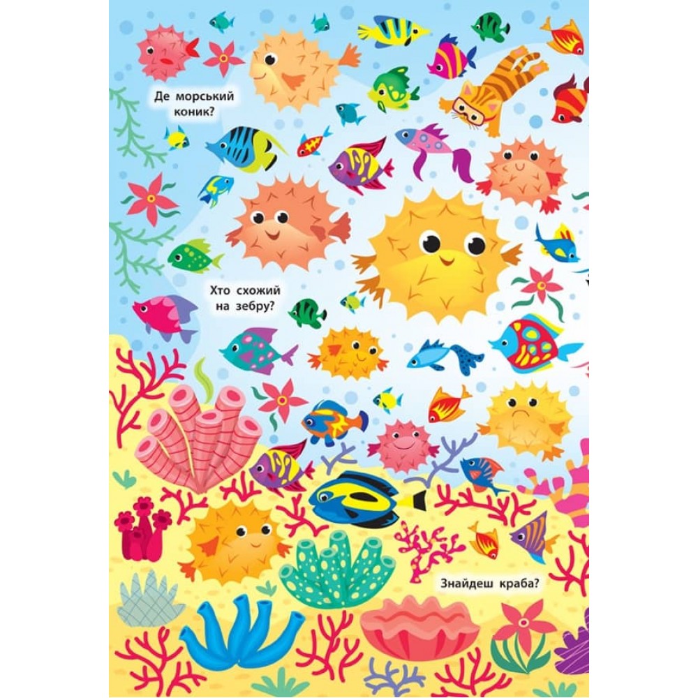 Це видання познайомить дитину з мешканцями підводного світу. Виконуючи завдання, маленький розумник розвине уяву, потренує пам’ять та увагу, навчиться міркувати, творчо підходити до вирішення різних завдань і зможе відчути себе справжнім слідопитом! Кожен розворот книжки містить велику барвисту ілюстрацію з безліччю різноманітних кумедних персонажів і запитання, що підкажуть, які несподіванки потрібно шукати на картинці.