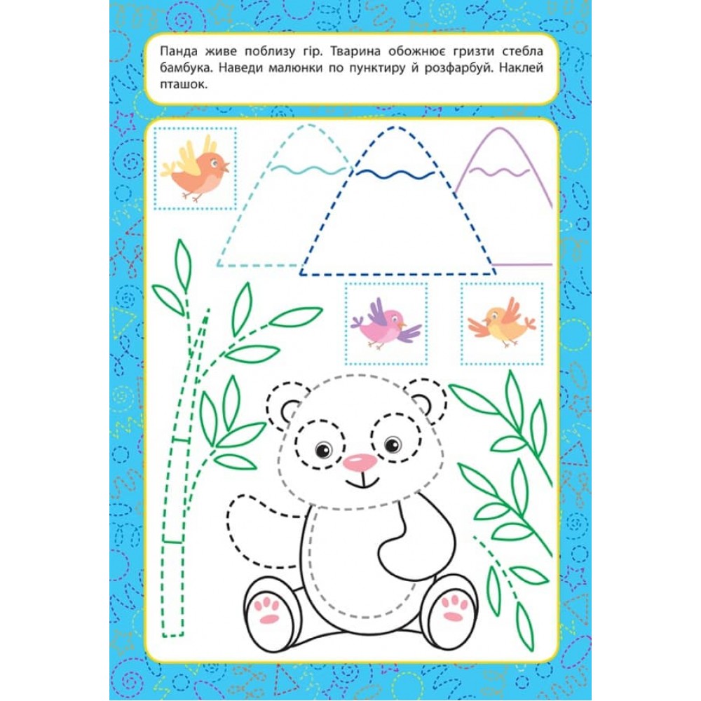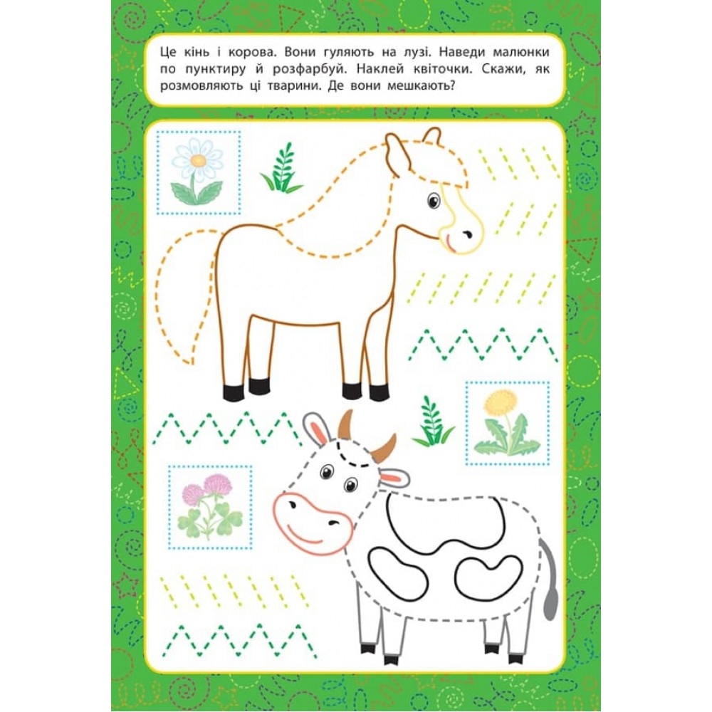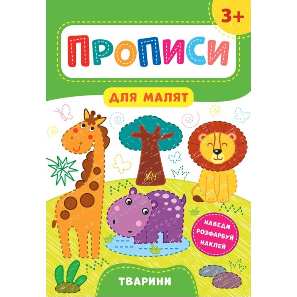 Це видання допоможе дитині вивчити назви тварин. Виконуючи завдання, малюк познайомиться з дикими й свійськими тваринами, наведе пунтирні лінії, розфарбує малюнки та попрацює з наліпками. Таким чином дитина підготує руку для майбутньої роботи з прописами для дошкільнят.