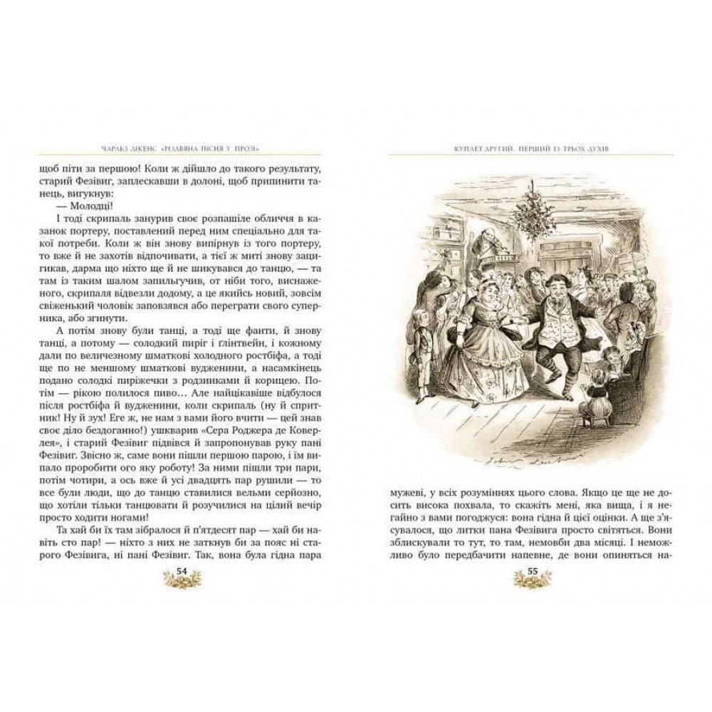 Напередодні Різдва  до скнари й відлюдника Ебенезера Скруджа навідуються чотири духи. Розповідаючи цю історію, Чарльз Дікенс хотів нагадати людям про справжню сутність і сенс цього чудового свята. Повість написано легко й водночас глибоко, з великою любов’ю. Тож не дивно, що ця книжка одразу стала сенсацією та справила неабиякий вплив на укріплення різдвяних традицій в XIX ст.  Вона й досі залишається живою й актуальною, промовляючи до людських сердець.