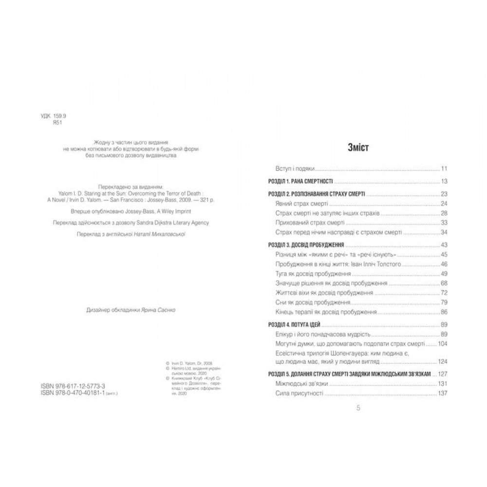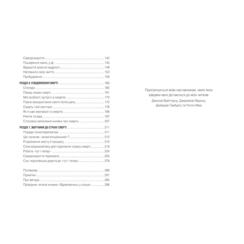 Страх смерті — у молодих та старих, він однаково переслідує нас протягом життя. Ірвін Ялом знає, як притлумити ці деструктивні та похмурі роздуми і прийняти життя в його неминучій скінченності.
