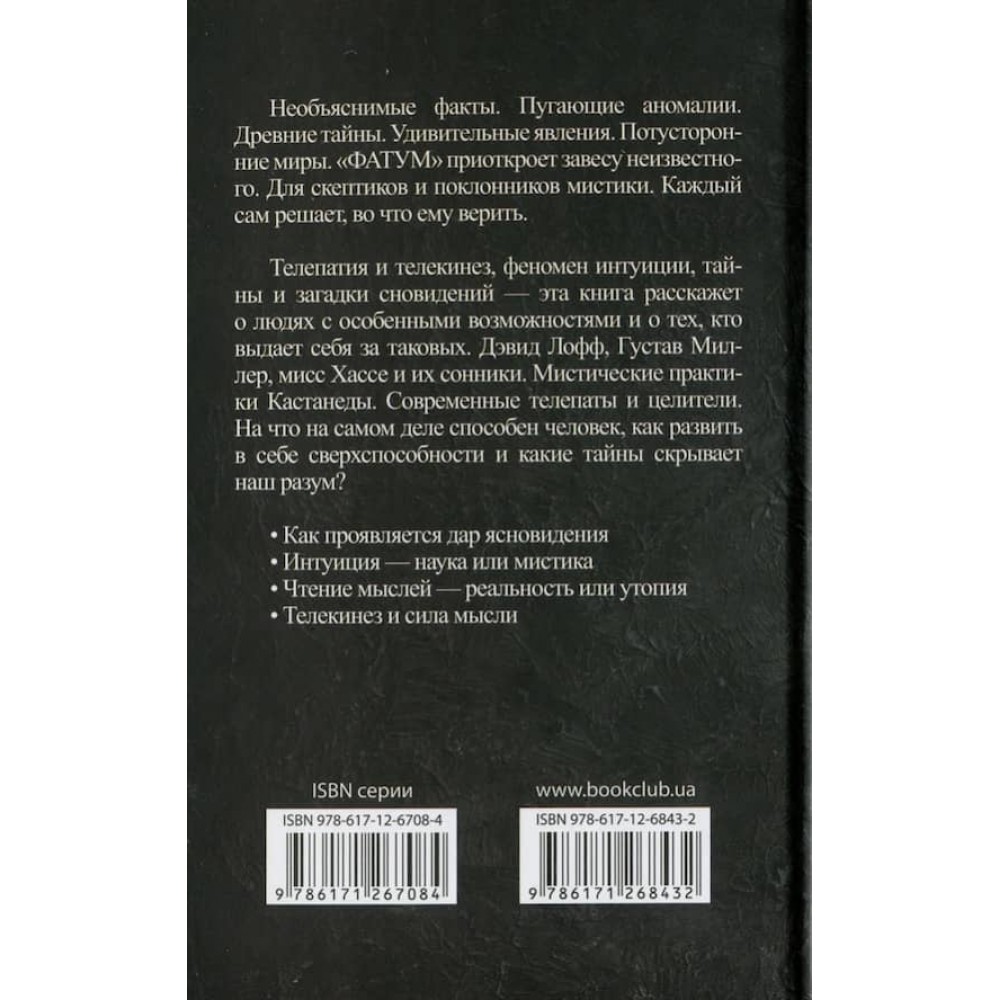 За своєю природою люди - істоти вкрай допитливі, тому все таємниче і незвідане приваблює і зачаровує. Серія «Фатум» буде вашим гідом у світ загадкових явищ і надприродних подій. Кожен сам вирішить, у що йому вірити.