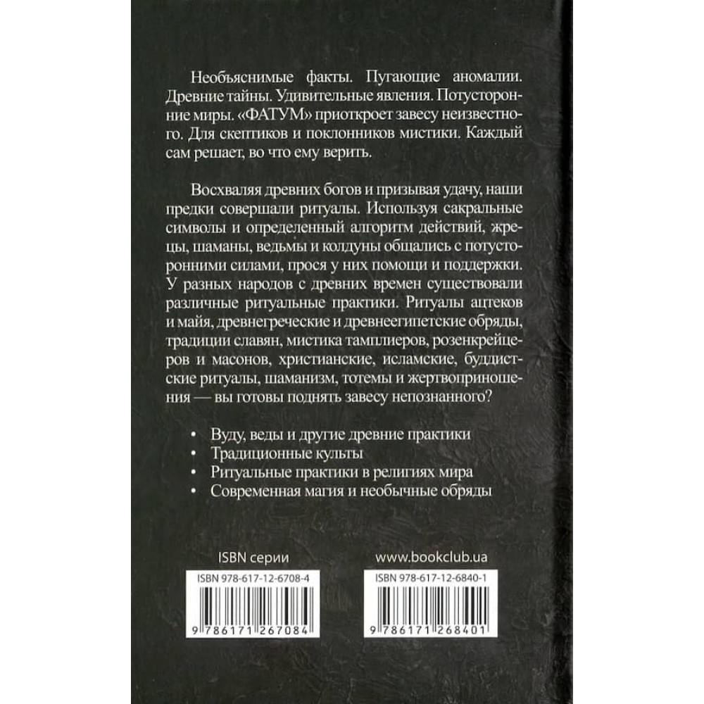 За своєю природою люди - істоти вкрай цікаві, тому все таємниче і незвідане привертає і зачаровує. Серія «Фатум» буде вашим гідом в світ загадкових явищ і надприродних подій. Кожен сам вирішить, у що йому вірити.