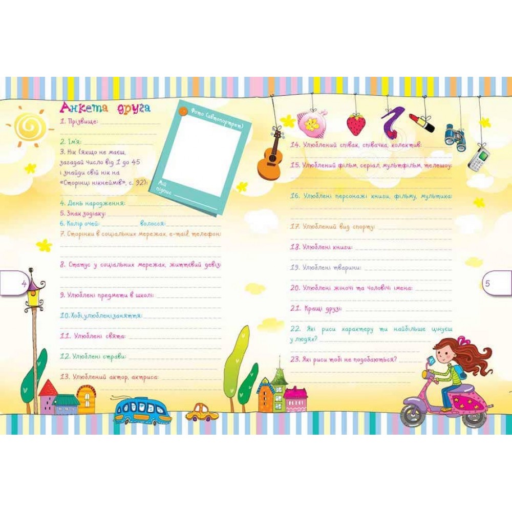Яскраво ілюстрований, дотепний, прикольний альбом друзів допоможе: краще пізнати своїх товаришів та однокласників і розповісти про себе; зберегти згадку про найкращих друзів і всілякі кумедні історії; весело і з користю провести час. Тут ви знайдете цікаві анкети, пізнавальні тести, ворожіння, каверзні загадки, а також сторінки, куди можна приклеїти фотографії улюблених акторів, співаків, спортсменів тощо. Це стильне видання стане чудовим подарунком для кожного підлітка.