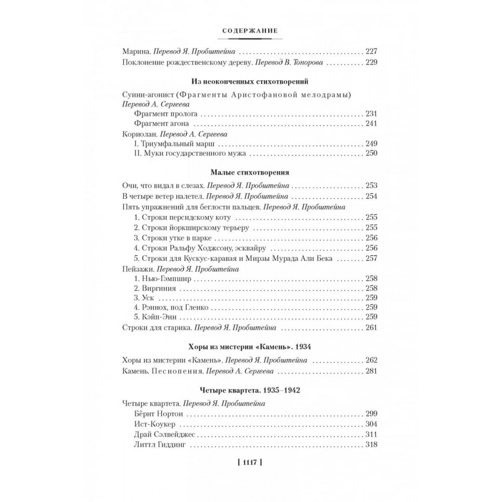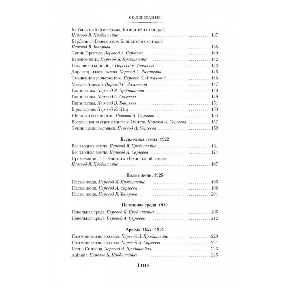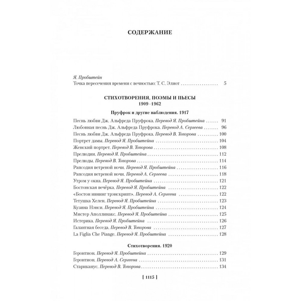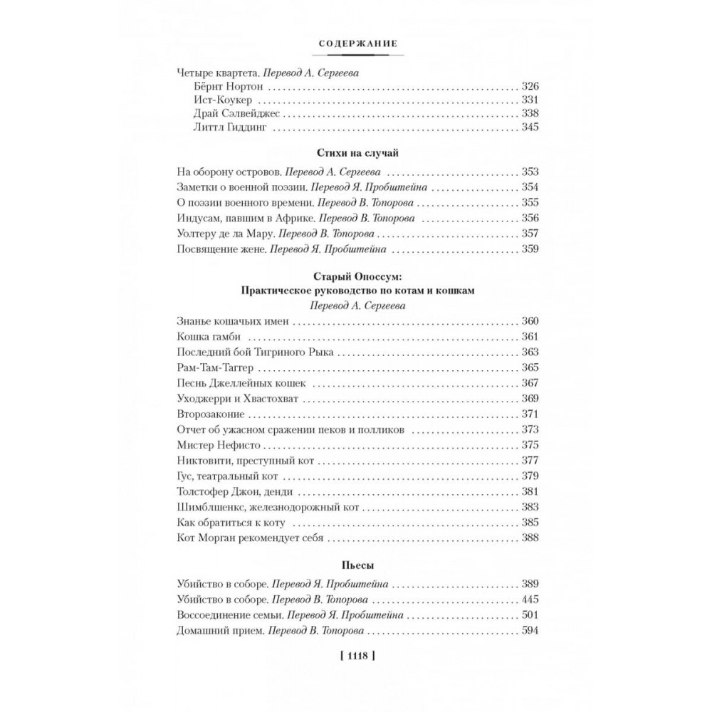 В даний видання увійшли всі поеми, вірші та п'єси Т. С. Еліота, вони представлені у варіантах перекладів.
