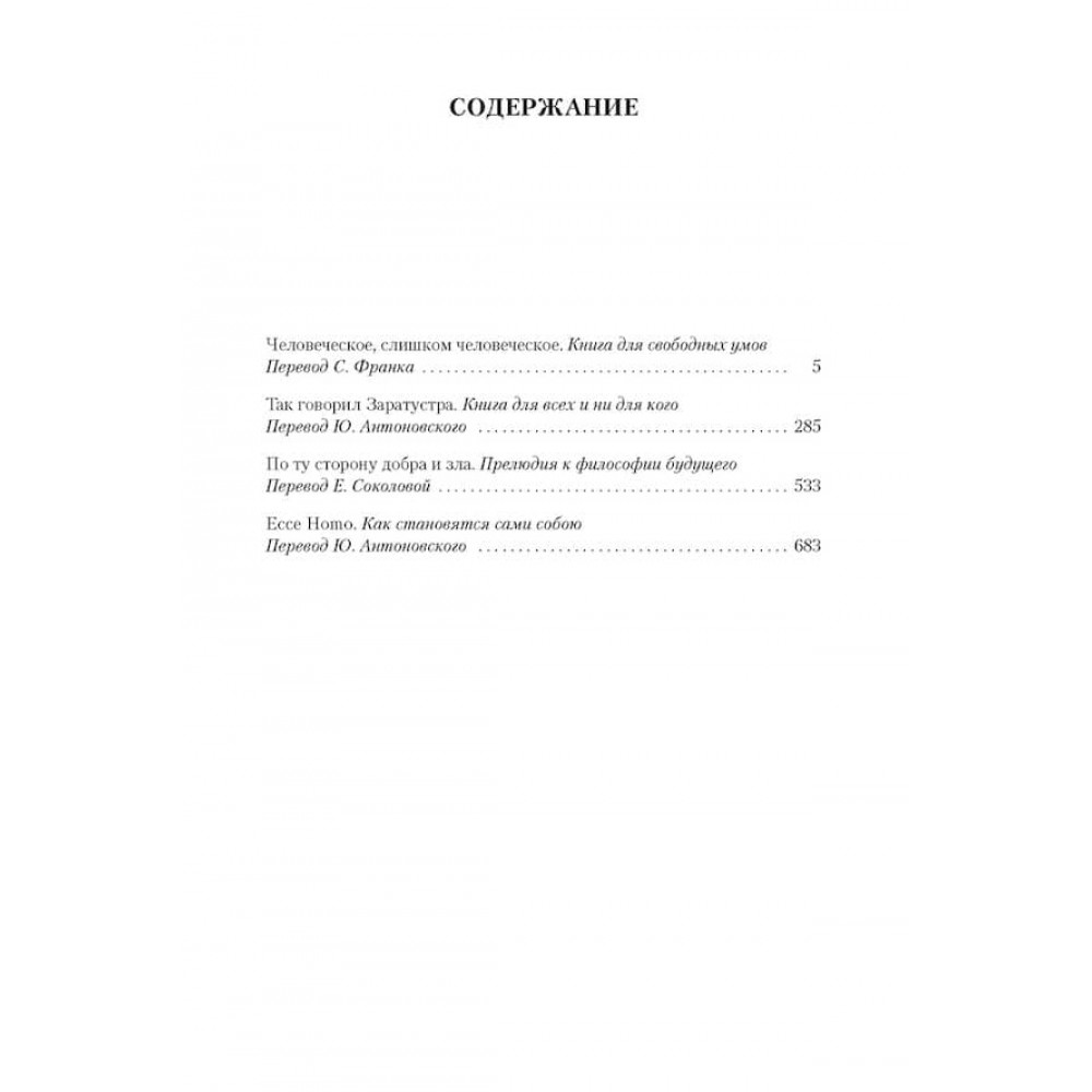 У цьому виданні представлені чотири найзначніші твори Ніцше, які відзначають ключові моменти життя і творчості цього великого мислителя: «Людське, надто людське», «Так казав Заратустра», «По той бік добра і зла», «Ecce Homo».