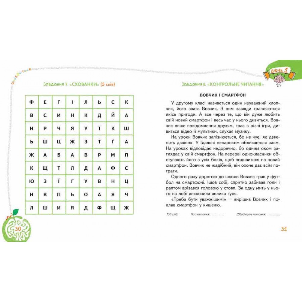 Книга-тренінг «Основи швидкочитання» — це унікальний посібник, який допоможе сформувати у дитини навичку читати швидко та якісно. Ще одна книга з-поміж низки навчальних та розвивальних видань відомого дитячого письменника, видавця, автора літератури для дітей Василя Федієнка. Педагог за освітою, він майстерно добирає завдання, які викликають у дітей зацікавлення й налаштовують на навчання. Захопливі нестандартні вправи в художньому оформленні Валерія Харченка спрямовані на те, щоб діти могли легко та невимушено опановувати ази швидкочитання. Деякі завдання на перший погляд здаються пустотливими, але насправді є ефективними педагогічними напрацюваннями, які приносять неперевершені результати. Схема занять за книгою досить проста: 25 хвилин щодня протягом 25 днів. Оригінальне видання містить детальні рекомендації, дотримуючись яких батьки зможуть з легкістю організувати процес навчання та досягти успішної взаємодії з дитиною.