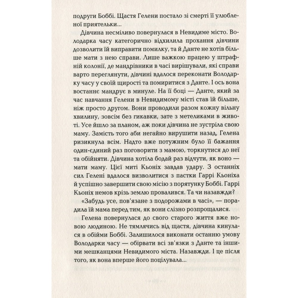 У цій книзі герої балансують поміж дружбою та зрадою. Гелена й Данте розійшлися й живуть кожен у власному світі, от лише годі забути одне одного… Тим часом Боббі прагне допомогти Гелені, ненароком опиняється в минулому й ледве борсається в реаліях початку двадцятого століття. Цією ситуацією користається Володарка часу й за визволення Боббі очікує від Гелени певної послуги. У цій колотнечі найлютіший ворог мандрівників у часі не дрімає, адже йому випав шанс усього його життя! І Гелена тепер повинна врятувати не тільки Боббі, а й цілий світ