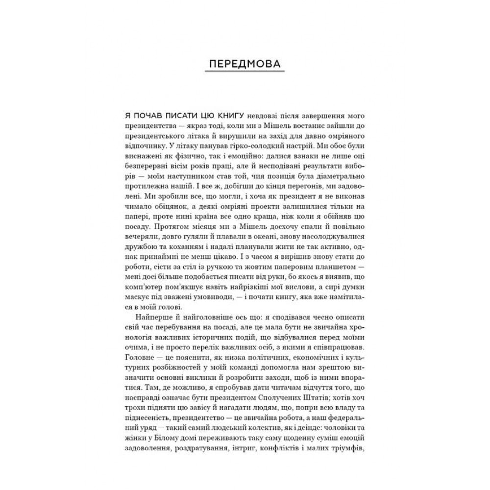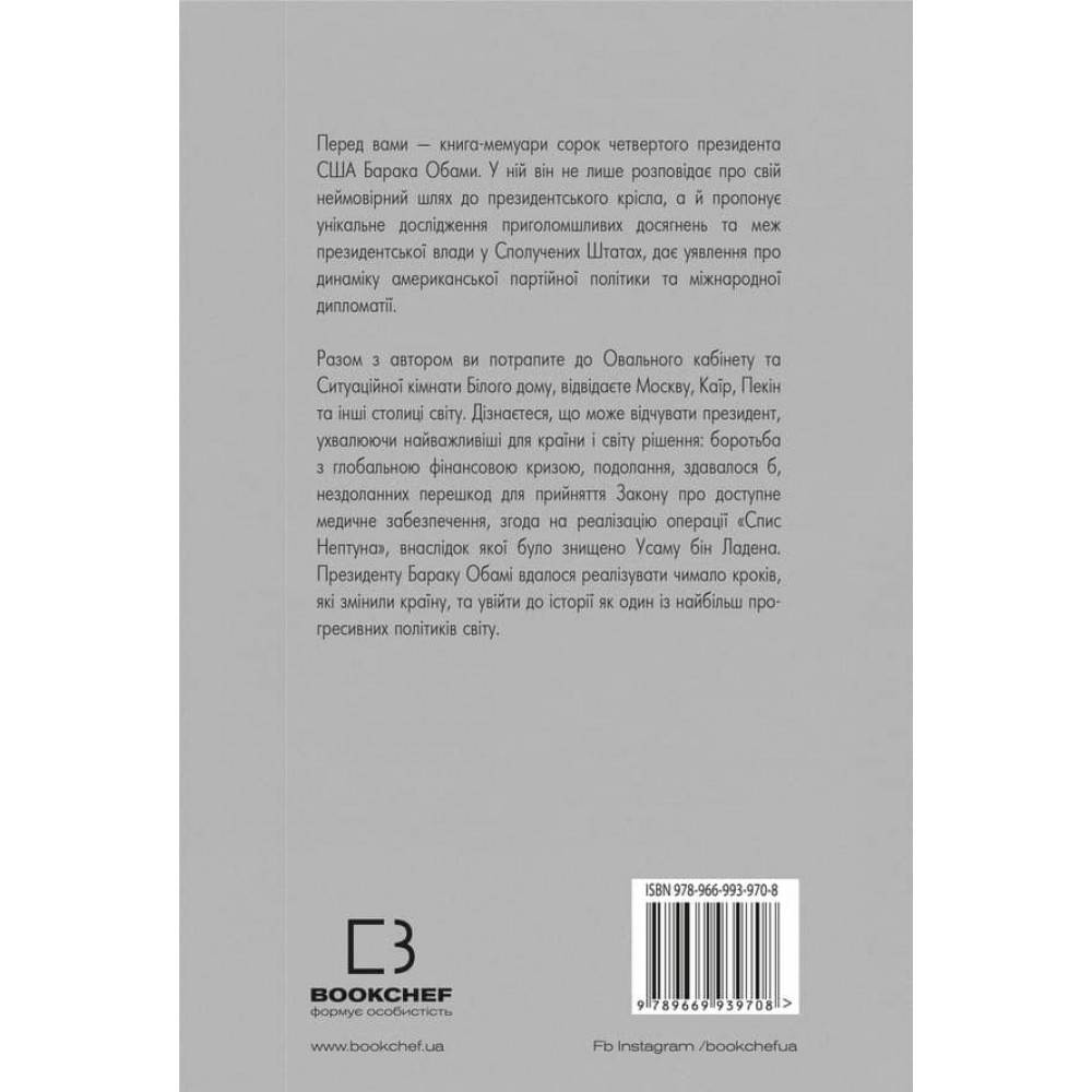 У своїх мемуарах Барак Обама розповідає не лише історію свого неймовірного шляху до президентського крісла. Він пропонує унікальне і продумане дослідження як приголомшливих здобутків і меж президентської влади, так і уявлення про динаміку партійної політики США та міжнародної дипломатії.