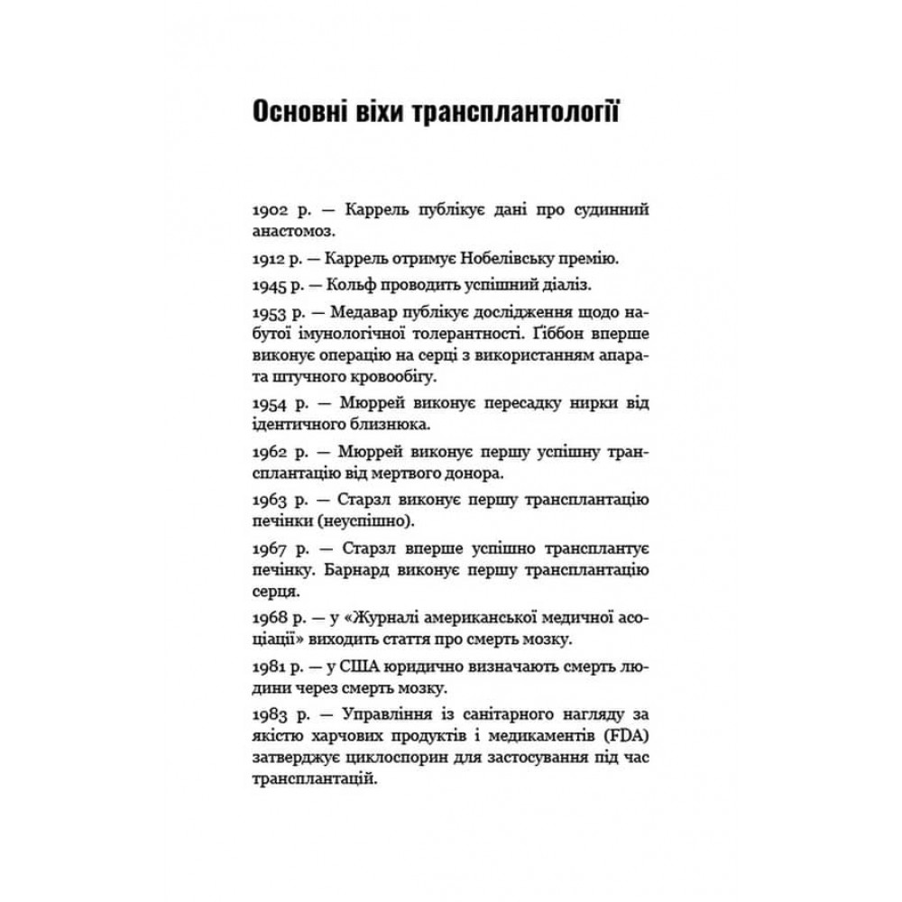 Читач разом із автором бере участь у заборі тканин та органів; потрапляє до операційних і спостерігає за тим, як нирка чи серце переселяються в тіло іншої людини; переживає неймовірні емоції — від страху помилитися до ейфорії успіху. Книга буде цікавою і лікарям, і пацієнтам, і не дотичним до медицини читачам, оскільки вона — про найважливіше для нас усіх: життя.
