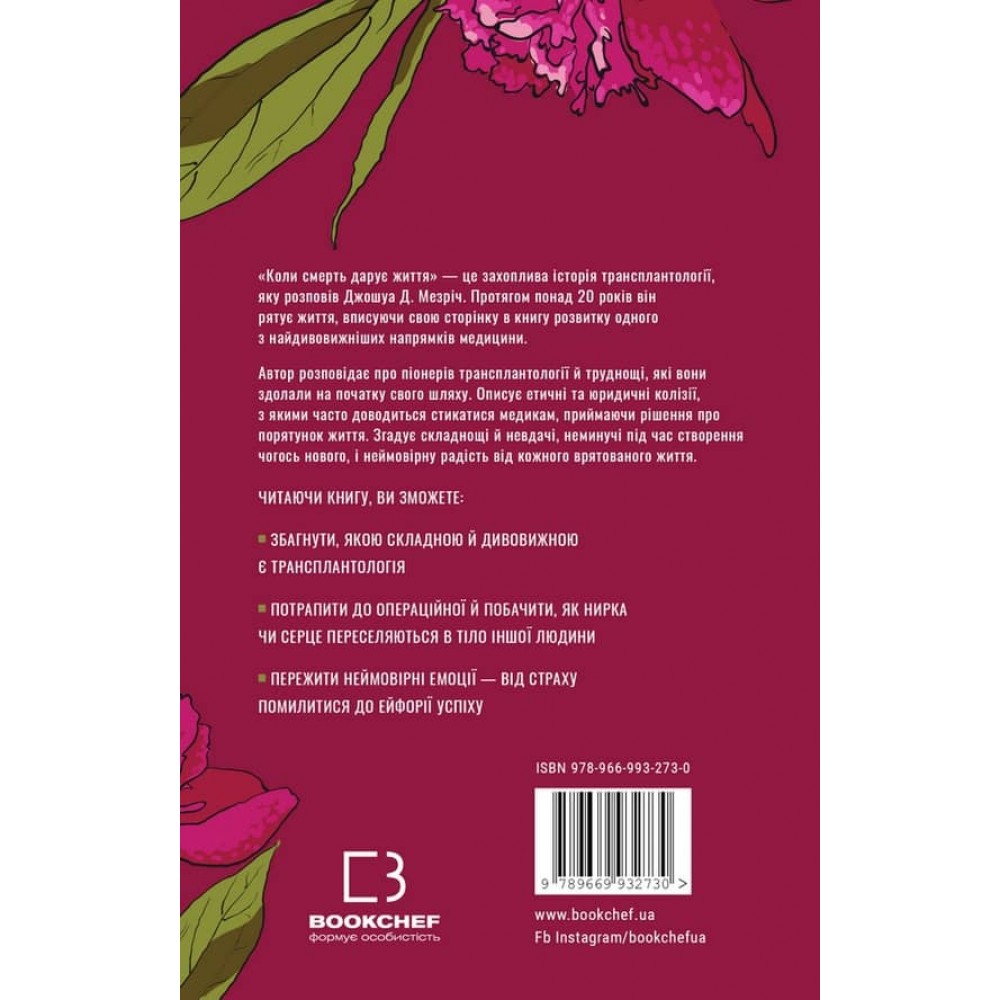 Історія такої звичної на сьогодні операції, як трансплантація тканин та органів однієї людини іншій, триває менш ніж століття. Однак протягом цього часу людство зробило значний крок на шляху до порятунку життів. Про піонерів трансплантології, труднощі, які їм довелося долати, етичні та юридичні колізії, складні рішення й радість від кожного врятованого життя хірург Джошуа Д. Мезріч розповідає в книзі «Коли смерть дарує життя».
