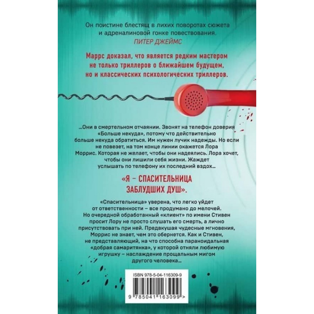 ...Вони у смертельному розпачі. Телефонують на телефон довіри "Більше нікуди", бо справді більше нікуди звернутися. Їм потрібен промінчик надії. Але якщо не пощастить, на тому кінці лінії виявиться Лора Морріс. Яка не бажає, щоб вони сподівалися. Лора хоче, щоб вони позбавили себе життя. Жадає почути по телефону їхній останній подих... І впевнена, що легко уникне відповідальності - все продумано до дрібниць. Але черговий оброблений "клієнт" на ім'я Стівен просить Лору не просто слухати його смерть, а особисто бути присутньою при ній. Передчуваючи чудові миті, Морріс не знає, чим це обернеться. Як і Стівен, який не уявляє, на що здатна параноїдальна "добра самаритянка", у якої забрали улюблену іграшку - насолоду прощальною миттю іншої людини...