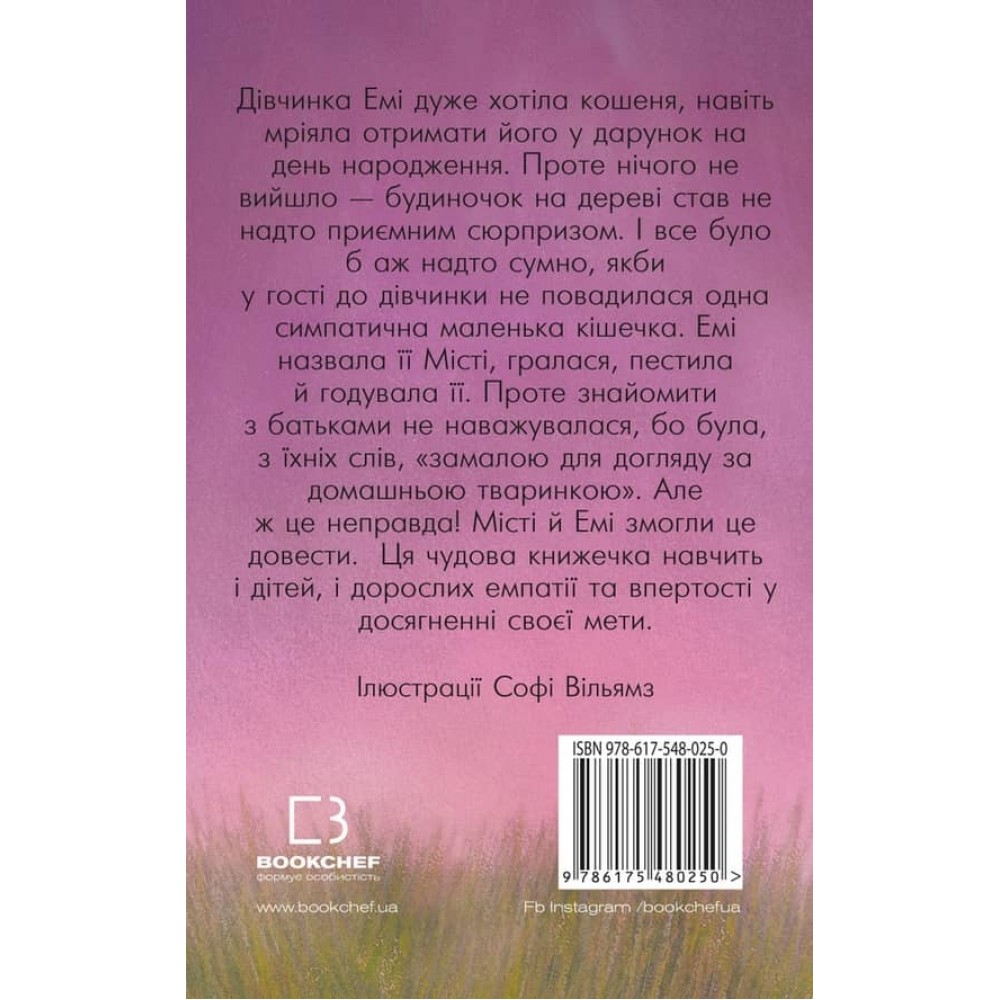 Дівчинка Емі дуже хотіла кошеня, навіть мріяла отримати його в подарунок на день народження. Проте нічого не вийшло - будиночок на дереві став не надто приємним сюрпризом. І все було б надто сумно, якби в гості до дівчинки не занадилася одна симпатична маленька кішечка. Емі назвала її Місті, гралася, пестила та годувала її. Однак знайомити з батьками не наважувалася, бо була, за їхніми словами, "маленькою для догляду за домашньою твариною". Але ж це неправда! Місті та Емі змогли це довести. Ця чудова книжка навчить і дітей, і дорослих емпатії та впертості в досягненні своєї мети.