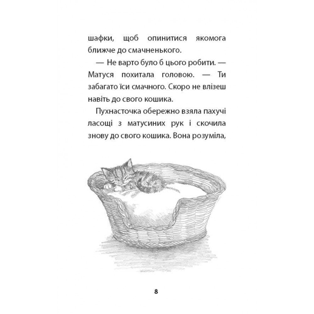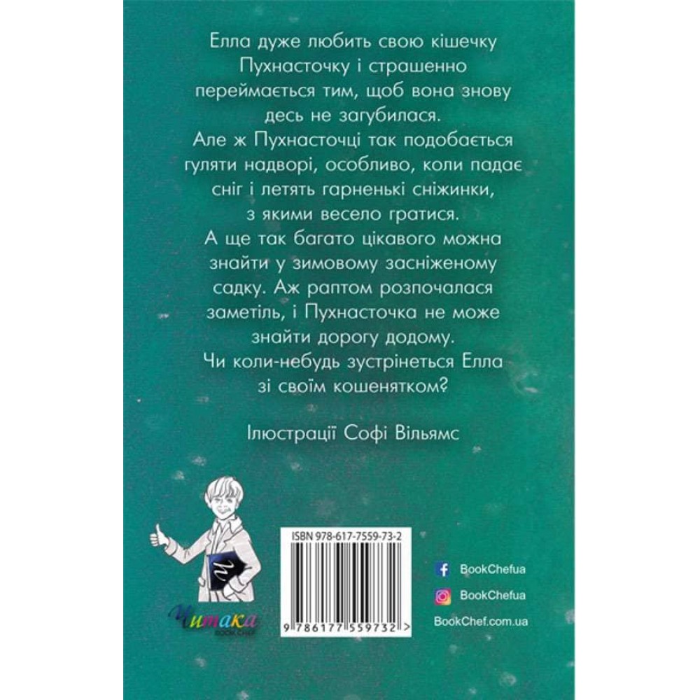 Елла дуже любить свою кішечку Пухнасточку і страшенно переймається тим, щоб вона знову десь не загубилася. Але ж Пухнасточці так подобається гуляти надворі, особливо, коли падає сніг і летять такі гарненькі сніжинки, з якими так весело гратися, та ще так багато цікавого можна знайти в зимовому засніженому садку. Аж раптом розпочалася заметіль, і Пухнасточка не може знайти дорогу додому. Чи коли-небудь зустрінеться Елла зі своїм кошенятком?