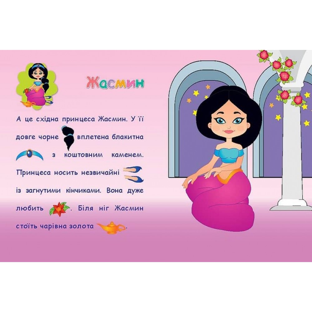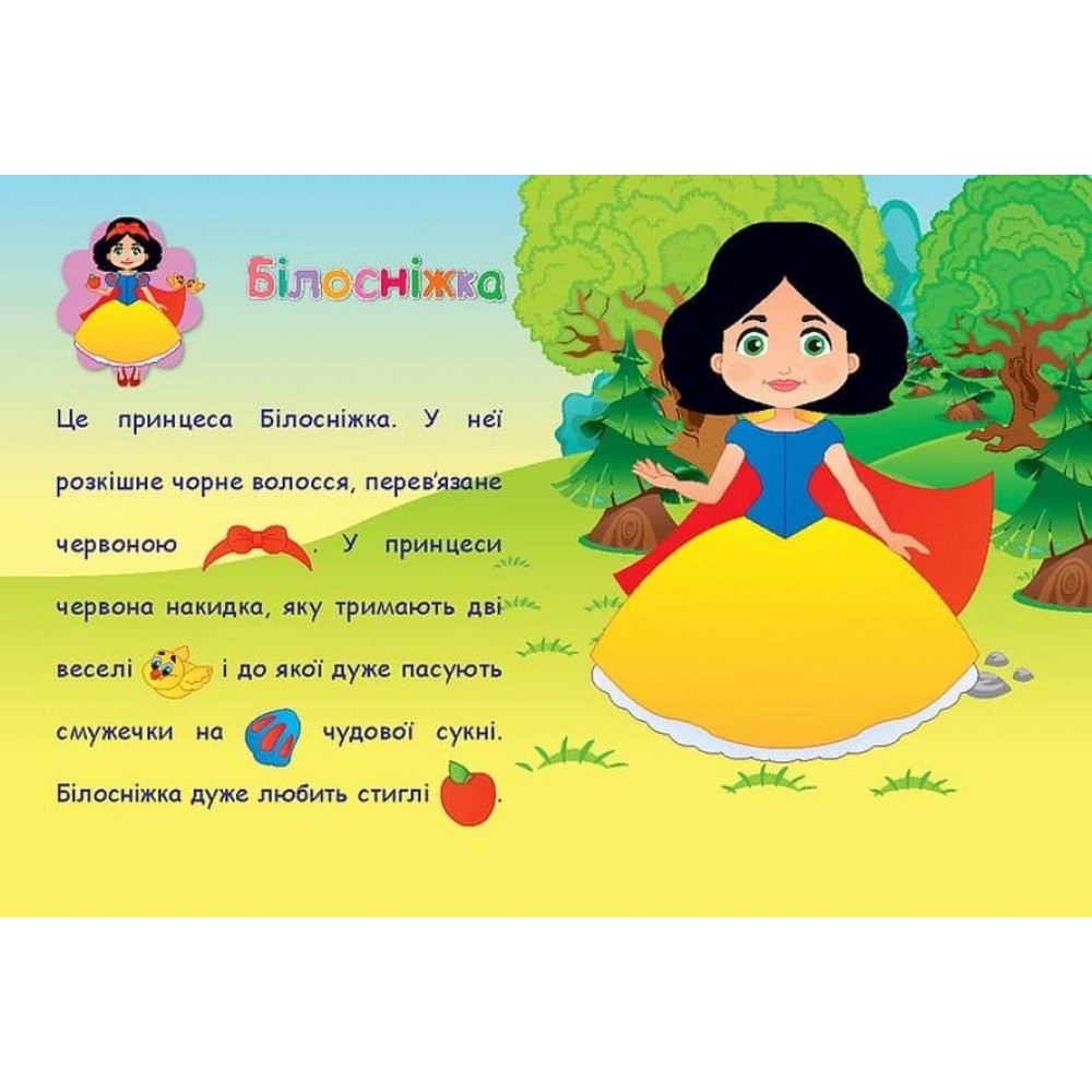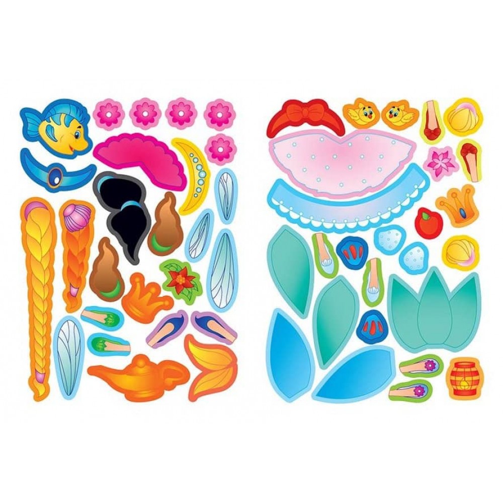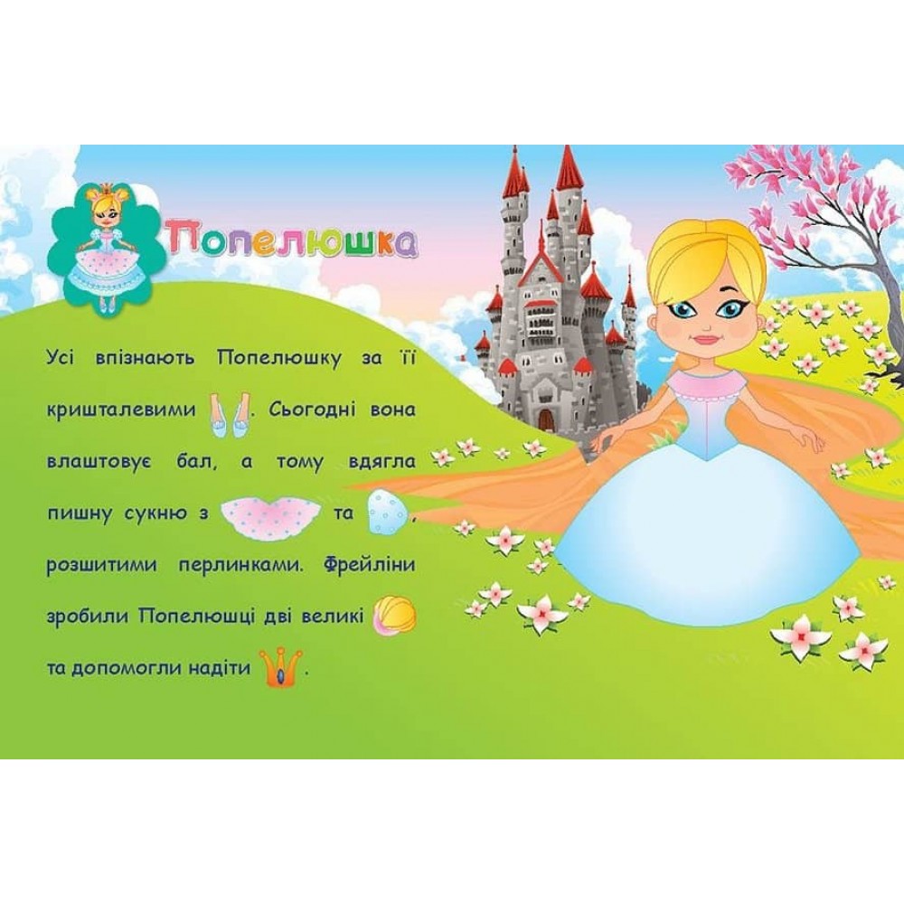 Разом із цим виданням малюк порине в чарівний світ разом з казковими принцесами. Прочитайте разом цікаві описи Жасмин, Попелюшки чи Білосніжки! Користуючись підказками, дитина зможе знайти та додати до малюнку туфельки, заколки чи зачіски принцес та інші деталі, щоб зібрати повне зображення. Щоб правильно розмістити наліпки, звертайте увагу на зразок. А ще з наліпок можна зібрати нову, ні на кого не схожу принцесу! Створюючи кольорову аплікацію, дитина розвиває дрібну моторику та вчиться співвідносити частину й ціле.