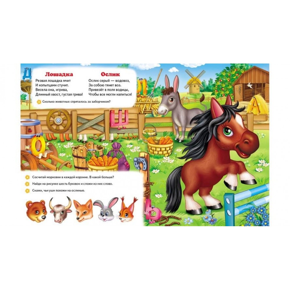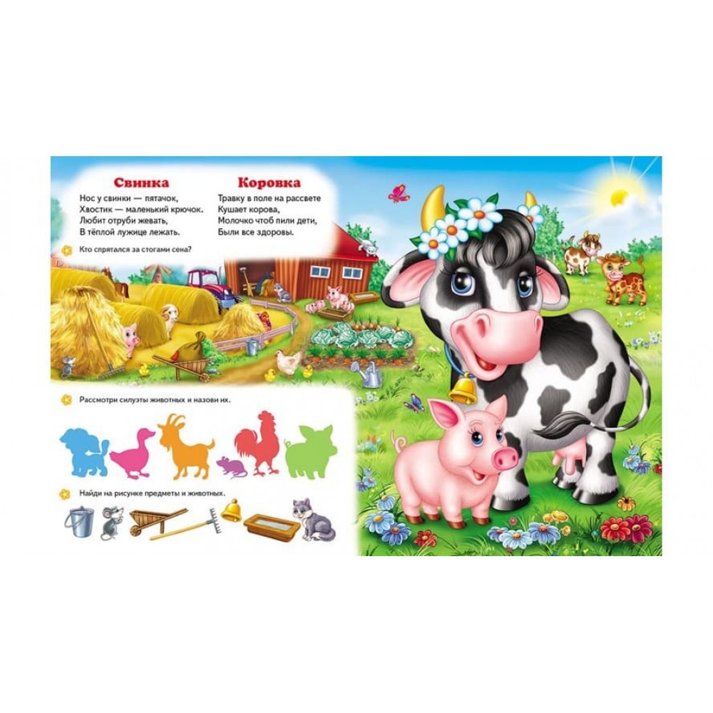 Така велика дитяча книжка! Яскраві фарби, щільний картон. Приємно тримати в руках, ніби й не книжка, а ціла коробка з іграми. Скажемо одразу, так і є. У її дванадцяти товстих сторінках заховані ті найцікавіші розвивальні ігри! На кожному розвороті по два віршики про мешканців веселої ферми і завдання на увагу, навчання рахунку, навички логічного мислення. Як же можна не виконати завдання з такими кумедними і симпатичними свинками, корівками, півником з курочкою, конячкою, качечкою? Вони нібито самі просять юних читачів відповісти, наприклад, чиї вуха схожі на ослячі. Або ж відшукати правильну тінь кошеняти. Цікаві ігри! Але ще класніша гра - на сторінках праворуч. Це пазли. У них усі мешканці веселої ферми! Дітлахам пропонується щоразу збирати їх докупи за малюнком, що захований одразу під пазлом.