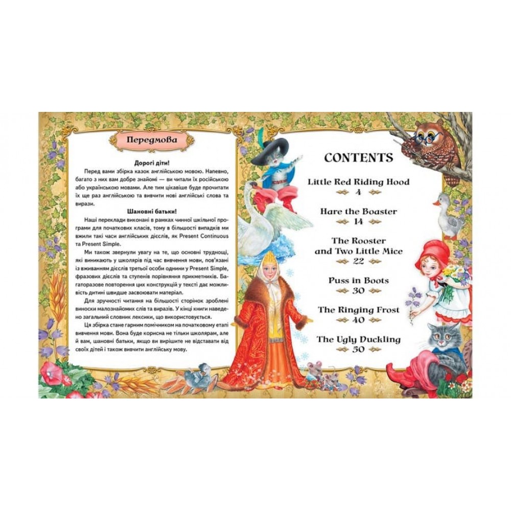Збірка казок пропонує читачам улюблені авторські та народні казки: «Колосок», «Червона Шапочка», «Кіт у чоботях», «Гидке каченя» та інші — англійською мовою. Чарівні історії рідною мовою звичні для кожного з нас. Книга «Казки англійською» дає можливість абсолютно по-новому поглянути на улюблені казки та їхніх героїв, а також застосувати знання англійської на практиці. Читати казки англійською мовою дуже цікаво і просто. На кожній сторінці подано переклад малознайомих і складних виразів. Наприкінці книги читачі знайдуть словничок використаної лексики. Збірка оформлена чудовими ілюстраціями. За яскравими незабутніми малюнками кожен малюк легко впізнає відомі казки. «Казки англійською» перетворять читання казок на цікаве і корисне заняття. А найменші дошкільнята почнуть вивчати англійську мову разом із дорослими. Батькам досить просто читати чудові казки, супроводжуючи їх перекладом. Спочатку познайомте малюка з казкою, разом розгляньте малюнки та назвіть імена героїв англійською. Повторюйте маляті найпростіші слова і фрази, пояснюйте їхнє значення. З «Казками англійською» вивчати іноземну мову легко і захопливо.