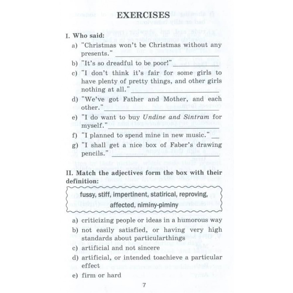 Текст супроводжується системою вправ, метою яких є перевірити розуміння змісту прочитаного, відпрацювати та закріпити лексику й граматичні конструкції, сприяти розвитку мовленнєвих навичок і творчих здібностей у дітей. Вправи розроблено з урахуванням сучасних вимог методики викладання іноземних мов.