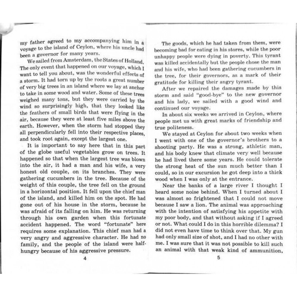 До книги увійшли адаптовані тексти відомих і надзвичайно популярних оповідань «Пригоди барона Мюнхгаузена», опублікованих видатним німецьким письменником Рудольфом Еріхом Распе.