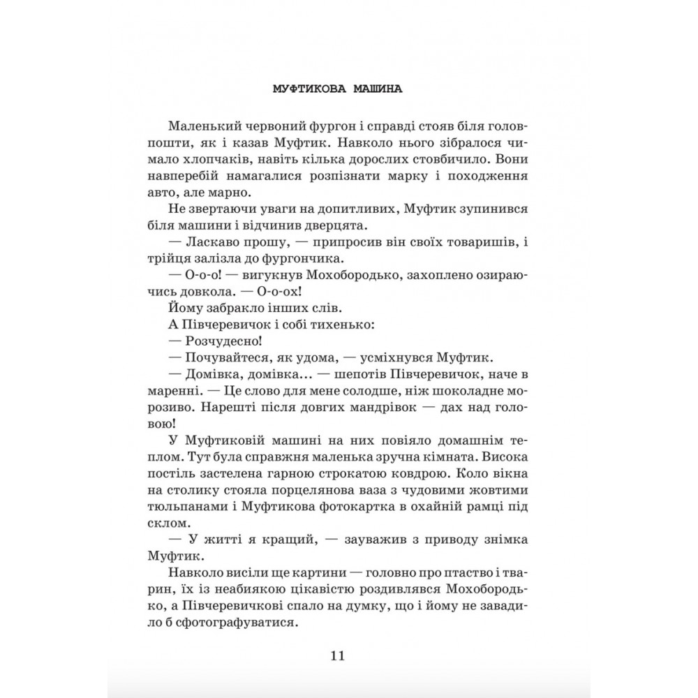 Ця книжка про цікаві пригоди трьох маленьких чоловічків: Муфтика, Півчеревичка та Мохобородька. Проте маленькими вони були тільки на зріст. Якщо судити за їхніми справами, ніхто не зважився б сказати, що вони маленькі. Трохи дивакуваті – можливо. Бо й справді, наші персонажі мали дещо незвичний вигляд. Муфтик завжди одягнений у велику муфту, Мохобородько має чудову бороду зі справжнього лісового моху, а Півчеревичок носить взуття з обрізаними носками, щоб зручніше було ворушити пальцями ніг. Це нове видання української версії пригод всесвітньо відомих персонажів естонського письменника Ено Рауда – Муфтика, Півчеревичка та Мохобородька.
