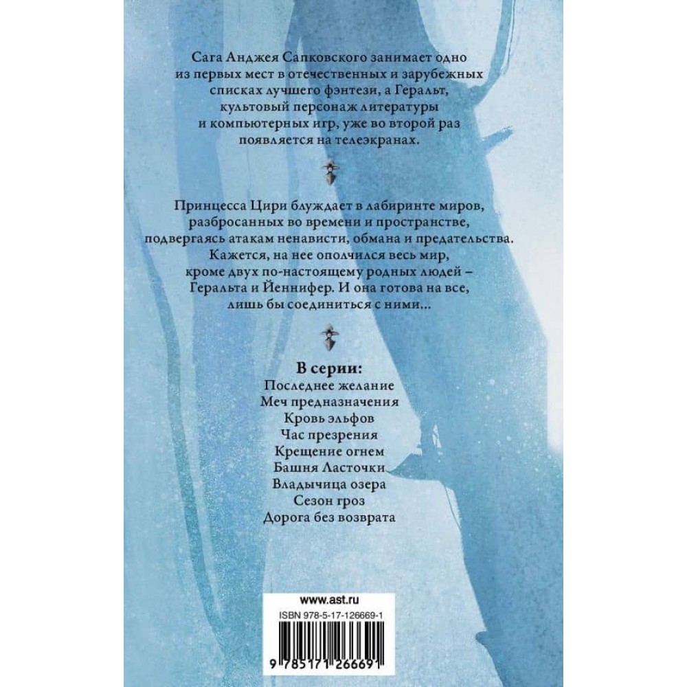 Принцеса Цирі блукає в лабіринті світів, розкиданих у часі та просторі, зазнаючи атак ненависті, обману та зради. Здається, на неї озброївся весь світ, крім двох по-справжньому рідних людей – Геральта та Єнніфер. І вона готова на все, аби з'єднатися з ними.