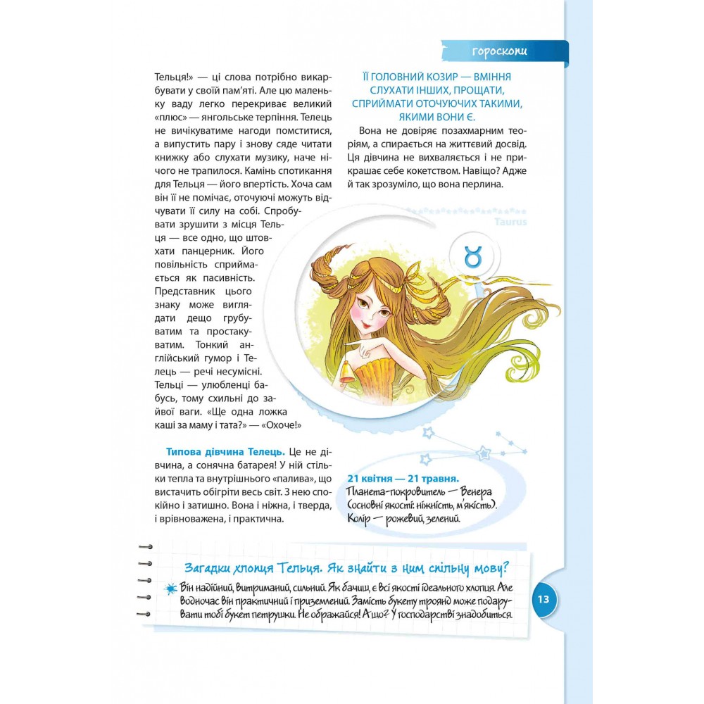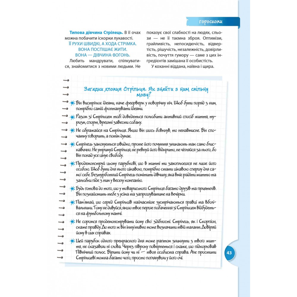 У книзі 6 розділів, які візуально легко відрізнити, бо кожен із них виділений окремим кольором. У кінці вона містить список використаних джерел, а позаду – повний перелік тем, які висвітлюються: знаки зодіаку, сонник, таємниці імен та чисел, види ворожінь, наводяться неймовірні факти надзвичайних здібностей, чудернацьких імен та прізвищ, кишеньковий словничок прикмет та ще купу відповідей на безліч таємниць. Складається з таких розділів: «Гороскопи», «Сонник», «Долю і конем не об’їдеш», «Загадки характеру», «Дивовижний світ навколо тебе», «Цікава психологія». Способів розгадати таємниці дуже багато — розгортайте «Книгу таємних знань», обирайте свій і нехай загадки зачарують вас!