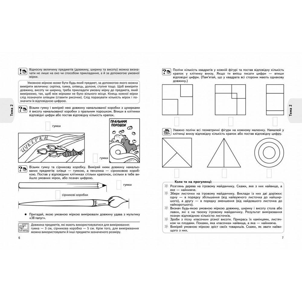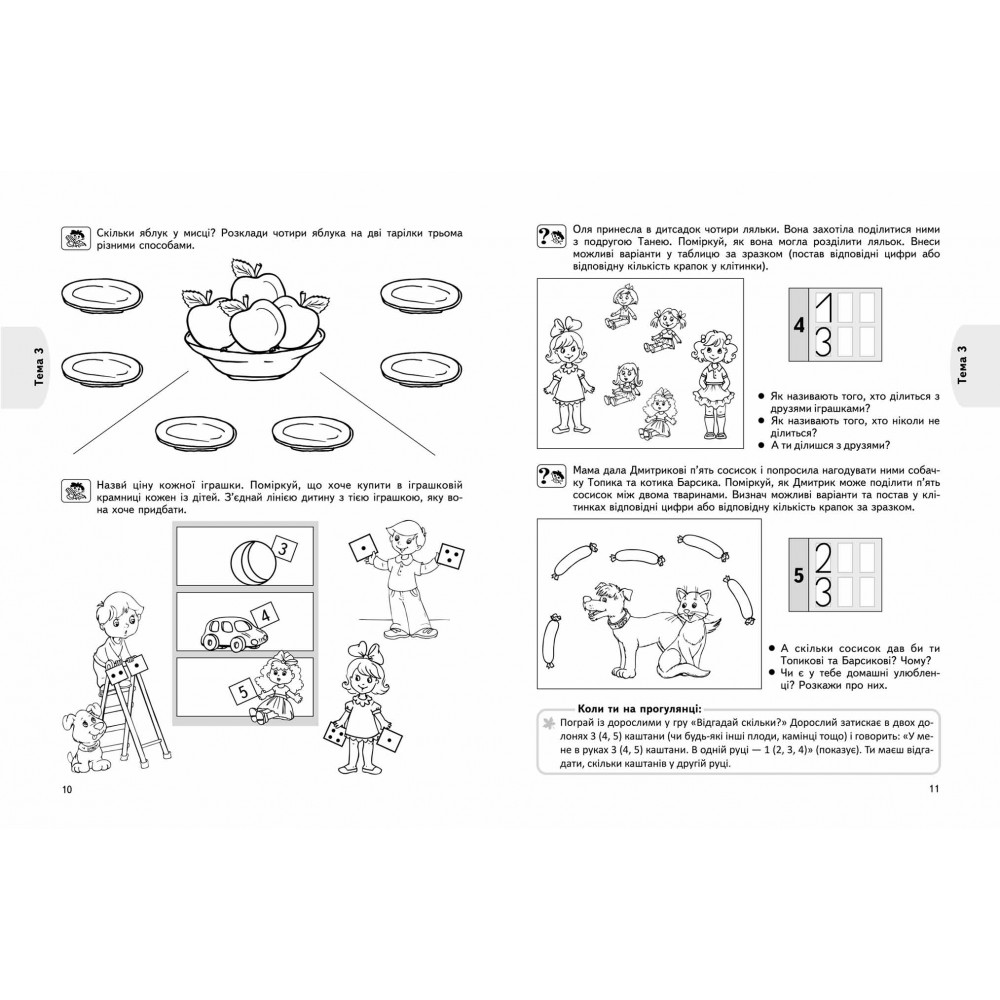 Працюючи за цим посібником, дитина навчиться: лічити предмети та розуміти склад чисел у межах 10; записувати та читати знайомі цифри й числа, знаки, схеми, малюнки; здійснювати найпростіші усні обчислення, складати і розв’язувати приклади, логіко-математичні задачі; порівнювати, зіставляти, аналізувати, класифікувати, узагальнювати, упорядковувати предмети за якісними ознаками та кількістю.