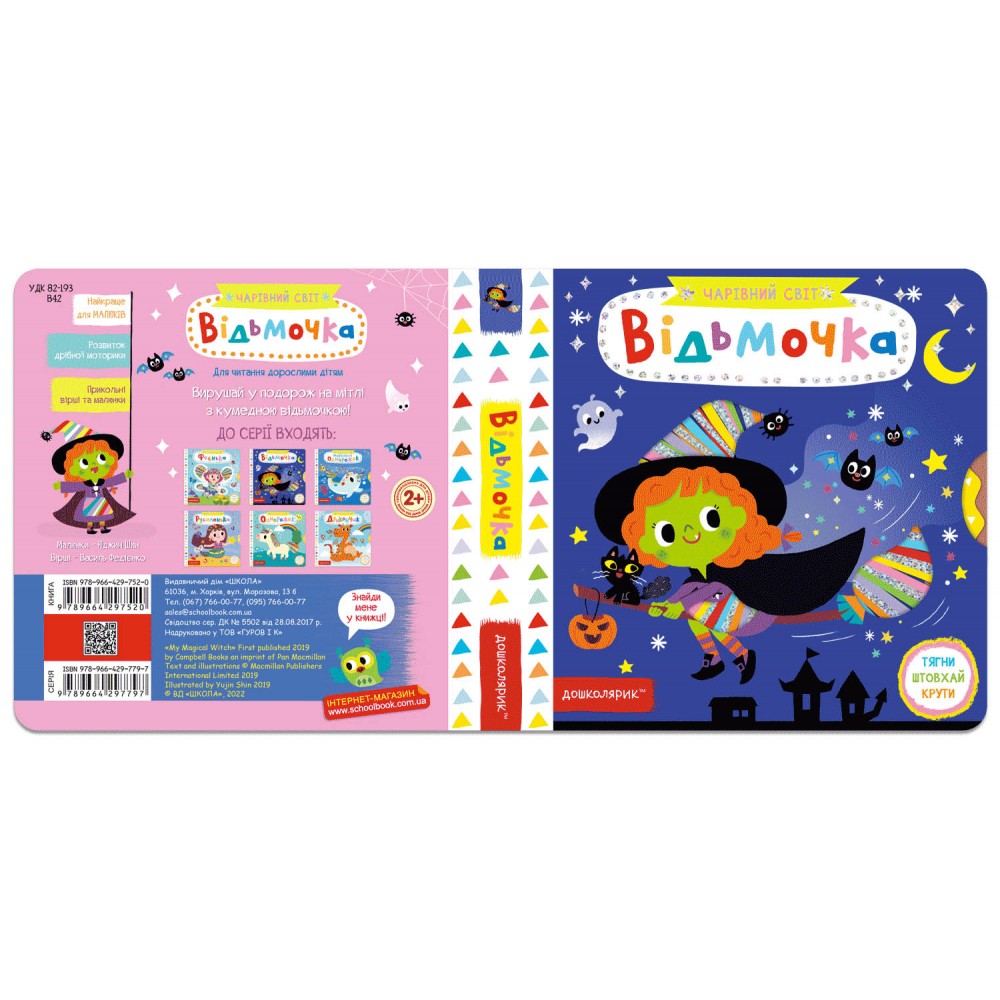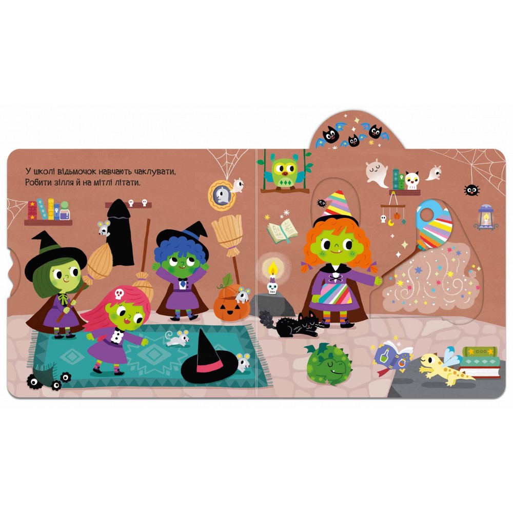 Гайда навчатись у школі відьмочок! Веселі вірші та барвисті малюнки познайомлять малечу з юними ученицями школи відьом, де вони навчаються варити цілюще зілля, літати на мітлі та створювати справжнього кота.