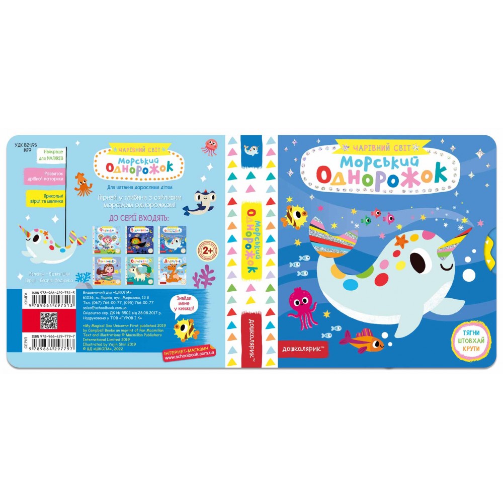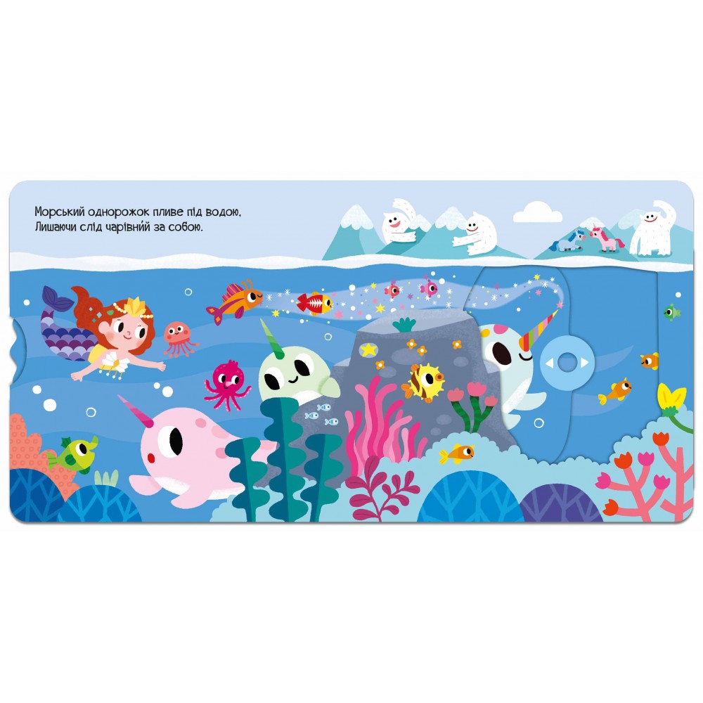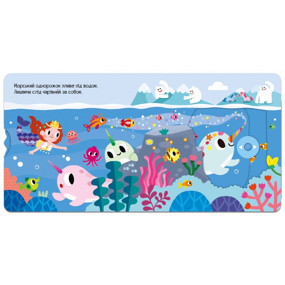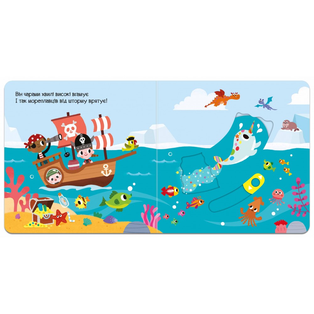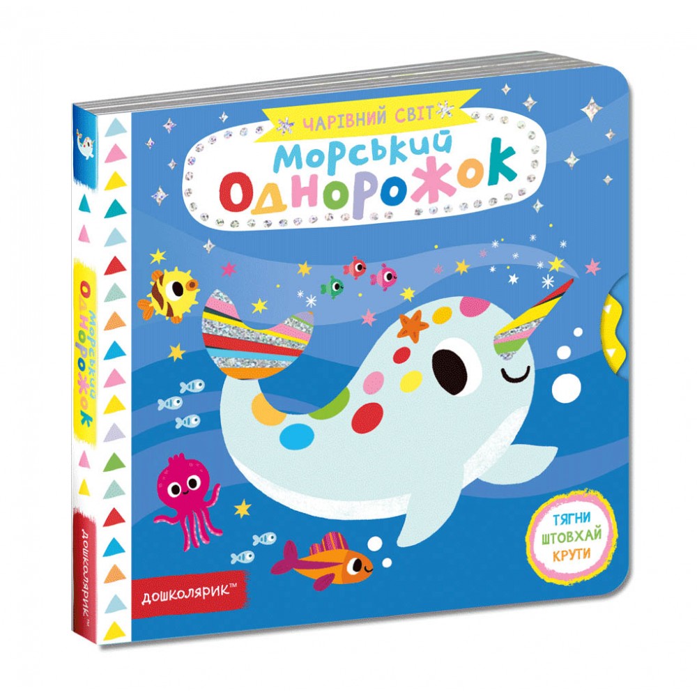 У виданні «Морський однорожок» читач зможе допомогти сміливому підводному звіру спасти моряків, розігнати підводну темряву й зустріти друзів. А щоб разом із героями поринути в захопливі пригоди, варто потягнути чи штовхнути за спеціальні стрілочки, покрутити кружечок та ін. Привабливі мерехтливі блискітки на обкладинці та яскраве оформлення видання всередині перетворить читання на цікаву гру, а розвивальні елементи сприятимуть розвитку дрібної моторики, пам’яті та уваги малюків. Для читання дорослими дітям.