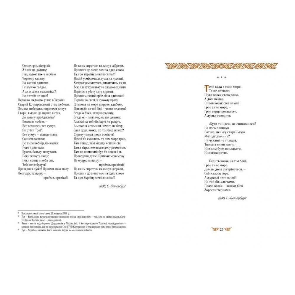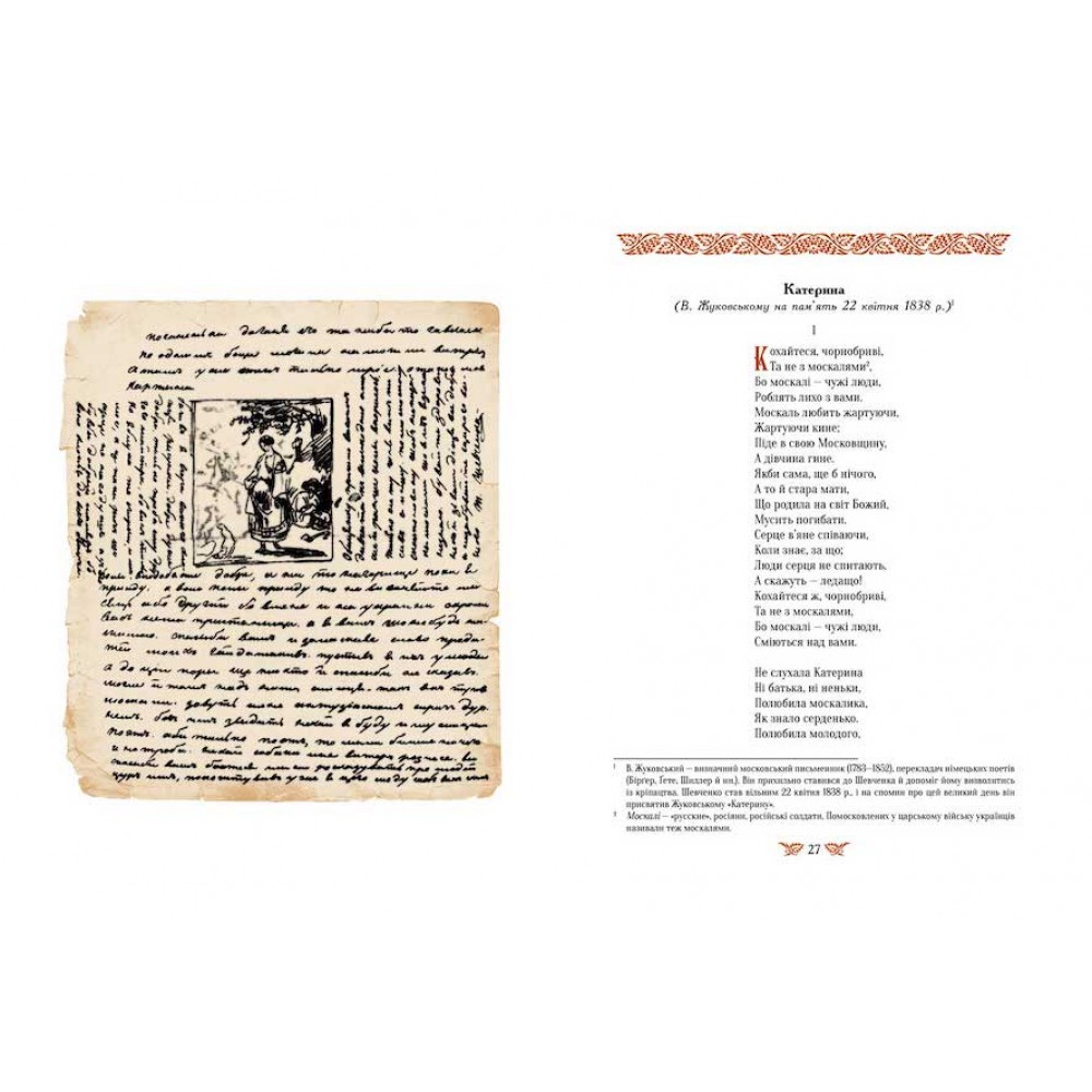 До того ж чимало творів подано з авторовими варіянтами, практично невідомими широкому загалові. Основну частину розпочинає поетова передмова до другого (нейздійсненого) видання «Кобзаря». Зануритись у Шевченкову добу допоможуть чимало унікальних прижиттєвих документів, автографів віршів, листів, світлин Поета і його автопортретів. І нарешті, усе видання, від першої до останньої сторінки, унормовано згідно з правилами українського правопису 1928 р. (т. зв. Харківського, або Скрипниківського правопису), який, на думку славетного Івана Огієнка, є історично й фонетично найближчим до мови, якою промовляв до нас Поет.