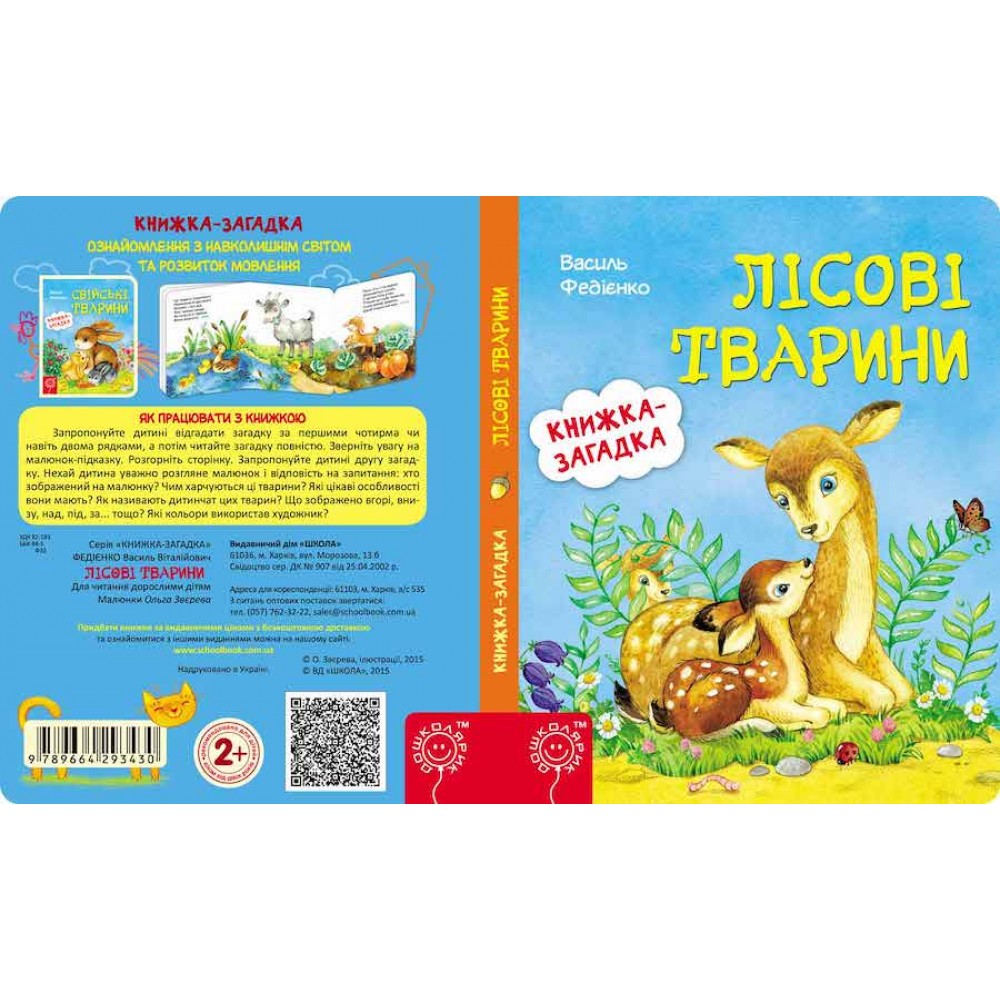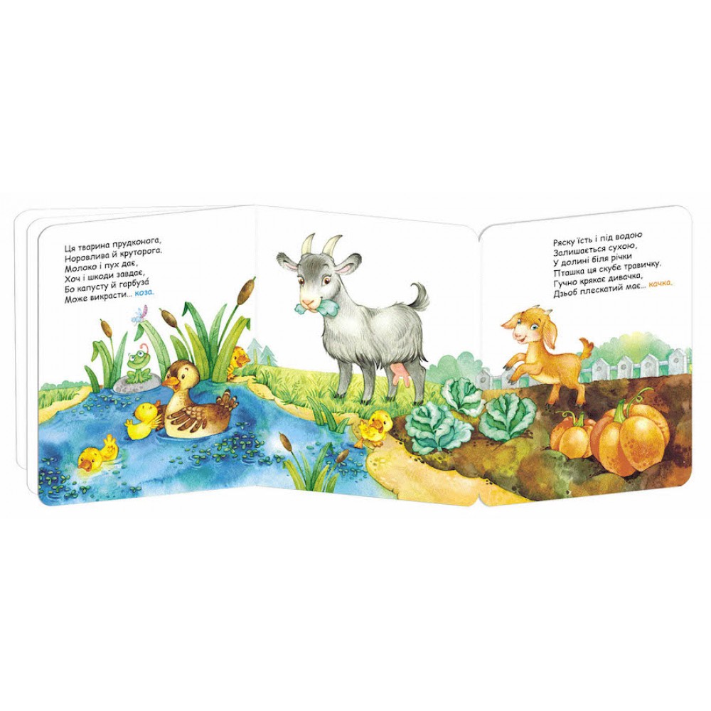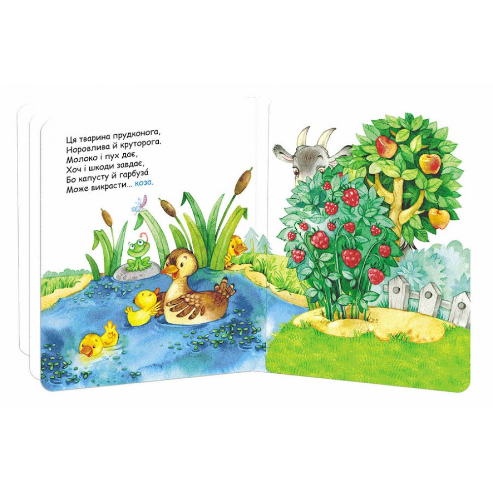 Кожен розворот «книжки-загадки» складається з 3-х сторінок. Остання з них спочатку закриває відповідь, на ній вже намальована відгадка, але тваринка схована за іншими об’єктами (за парканом, рослинами або іншими тваринами). Така композиція сприяє розвиткові уваги маленьких читачів, бо якщо читати віршик та придивлятися на сусідню сторінку, можна здогадатися, про яку тваринку йдеться. Зі зворотного боку 3 сторінки написана інша загадка, а відповідь на неї намальована на сторінці з попередньою загадкою. Видання допоможуть малечі легко запам’ятати свійських та лісових тварин завдяки цікавій формі самих «книжок-загадок».