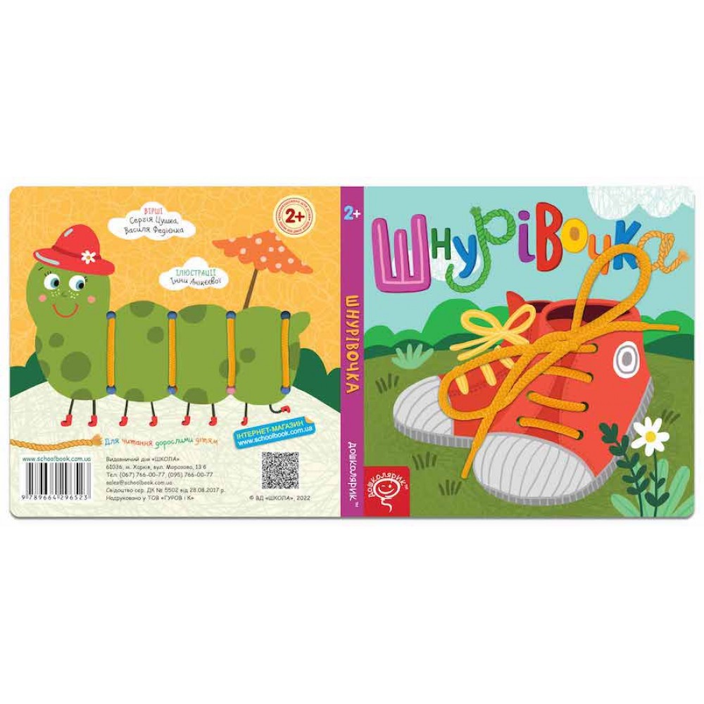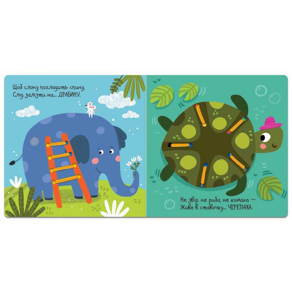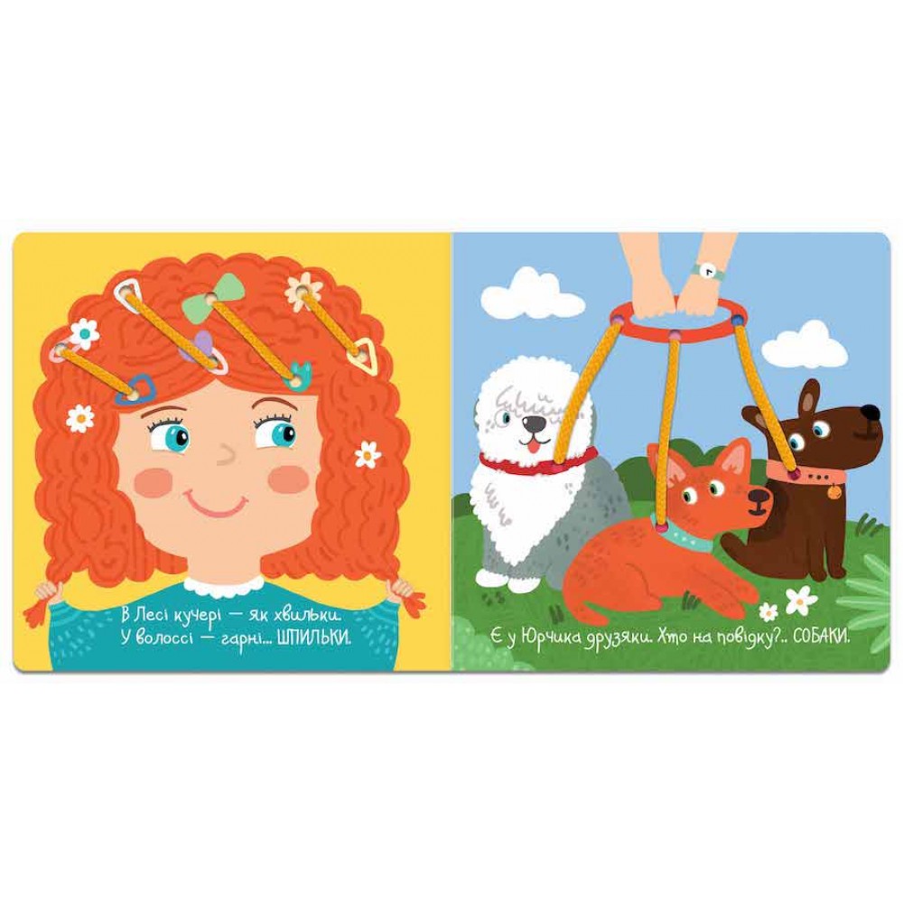 Ця захоплива книжка-забавка допоможе в розвиткові навичок дрібної моторики долонь, покращить хапальний рефлекс і зміцнить м'язи великого пальця, що для дітей 2+ свідчить про успішність загального розвитку дитини. Усередині картонки є віршики-загадки про звірят, дитячі забавки, час доби та різні цікавинки. За допомогою шнурочка, який потрібно просувати у спеціальні отвори на сторінках книги, дошколята зможуть разом з хлопчаками вигуляти песиків на повідку, прикрасити кучері дівчинки шпильками, зібрати квіточки в букет для матусі та багато іншого. Виконуючи цікаві завдання на шнурівку разом із дорослими, дитина розвине уяву, збагатить кругозір та фантазію, розширить словниковий запас