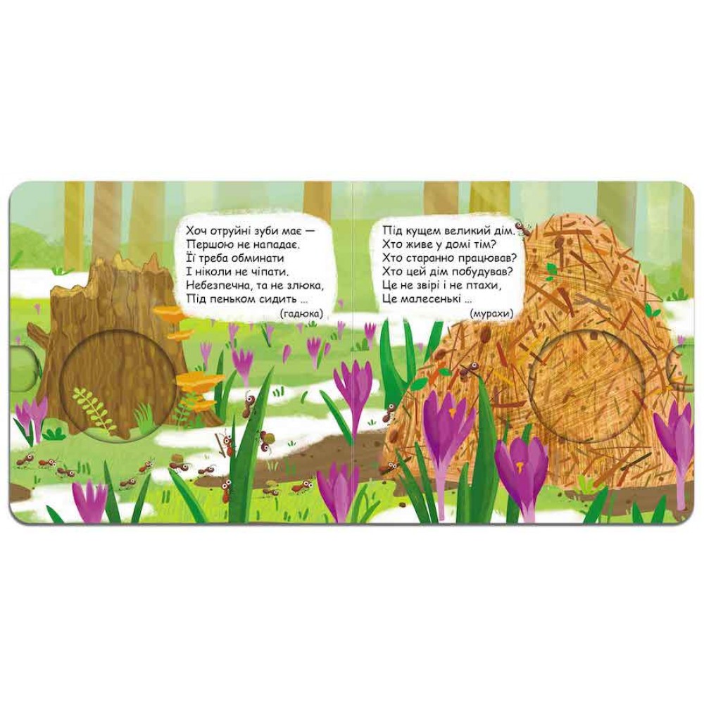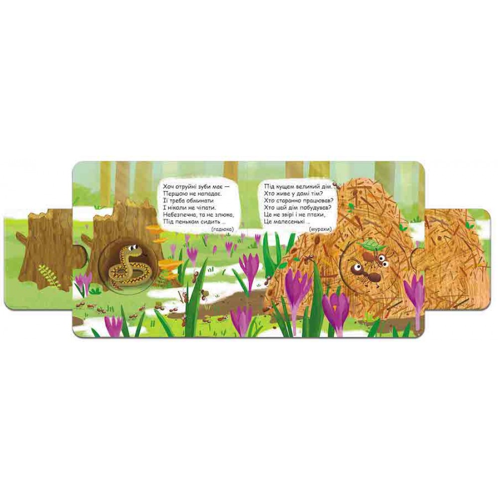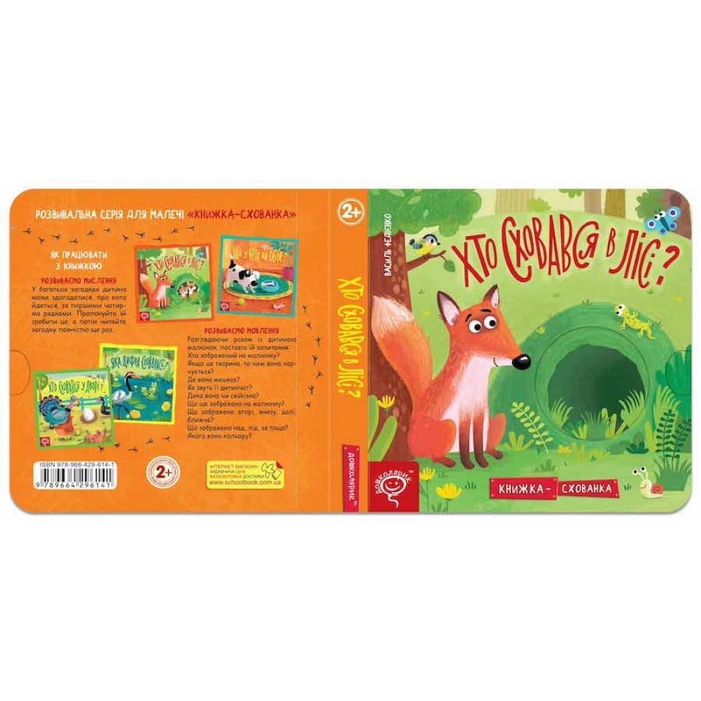 Розглядаючи малюнки із дитиною, ставте їй запитання: кого зображено на малюнку? Чим характеризується ця тварина? Де вона мешкає, яке має забарвлення? Як звати її дитинчат? Що зображено на сторінці вгорі, внизу, далі, ближче тощо. Розвивальна серія для малечі «Книжка-схованка» сприятиме розвиткові пам'яті та уваги, логічного та образного мислення, поповнить словниковий запас маленького читача.