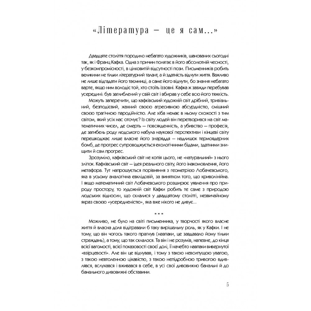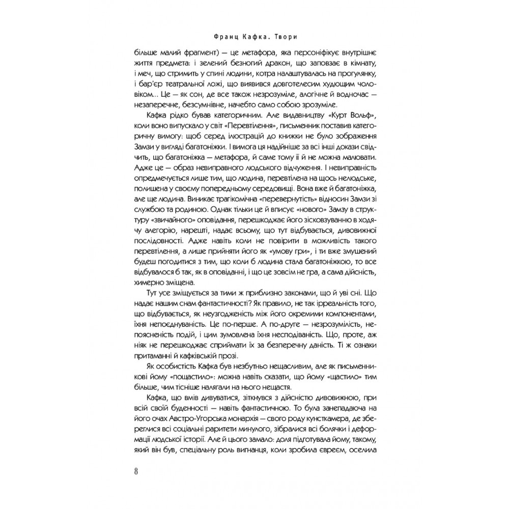 У книзі вибраних творів Франца Кафки — одного з найвидат-ніших німецькомовних письменників ХХ століття, австрійського чиновника, єврейського страдника і громадянина Чехії — подано оповідання з усіх прижиттєвих та посмертних видань, романи «Процес», «Америка» (уривок), «Замок» (уривок), а також його листи і щоденники.