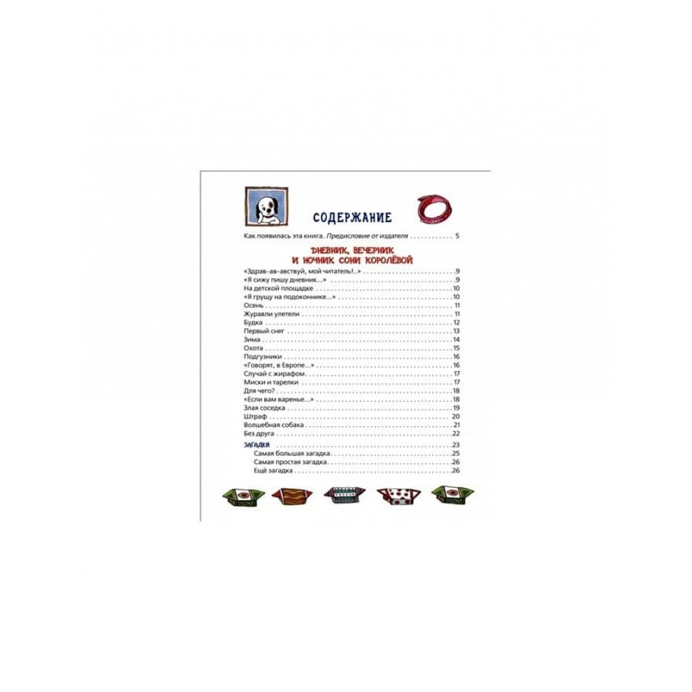 Маленька собачка Соня не лише надзвичайно розумна і знаменита, а й дуже талановита! Вона складає вірші про все, що з нею відбувається, і записує їх у свій щоденник, який за сумісництвом є ще й "вечірником", і "нічником". Адже до справжнього поета натхнення приходить не тільки вдень! Про шкідливу сусідку Пчолкіну, про коханого господаря Івана Івановича, про пилосос, який виє, про Білку, Стрілку і літаючу тарілку - словом, про все на світі ви прочитаєте у віршах маленького, але дуже розумного песика, що полюбився і великим, і маленьким читачам.