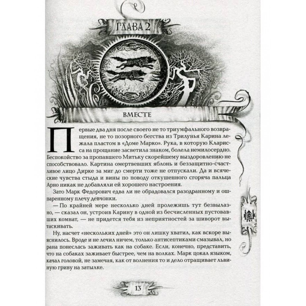 Пригоди в Трилуньї тривають. Місячні стежки вже звично розгортаються під ногами Карини та її друзів. Вони прагнуть дізнатися, де захована вовча карта-перевертень, дістатися до неї раніше за смертельних ворогів, зупинити омертвіння в обох світах! Але куди бігти, кому вірити, якщо все навколо хитке, як міраж, власні руді кучері переливаються всіма відтінками червоного, могутні кріпосні стіни проникні, як повітря, а друзі - зовсім не друзі?