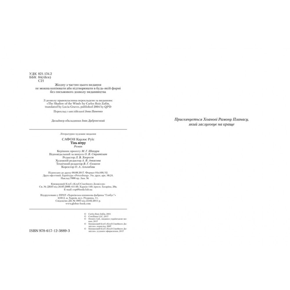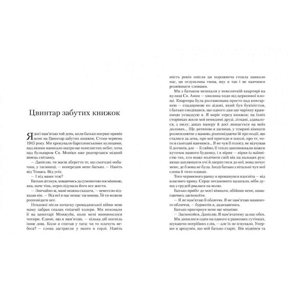 Книжка містить цілий світ. Вона може відповісти на багато запитань, а інколи може втрутитися у ваше життя — і змінити його до невпізнання... Знайшовши на Цвинтарі забутих книжок твір маловідомого письменника, юний Даніель за одну ніч прочитує його. І розуміє, що віднині життя не буде таким, як раніше. Про що ця історія? Про вигадливі лабіринти фантазії? Про диявола, який сходить зі сторінок книжки й починає плутати карти всім дійовим особам? Про війну, яка нівечить людські життя? Так, але передусім це, звісно, історія про кохання, про вічний потяг душ і тіл, заради якого тільки й варто жити.