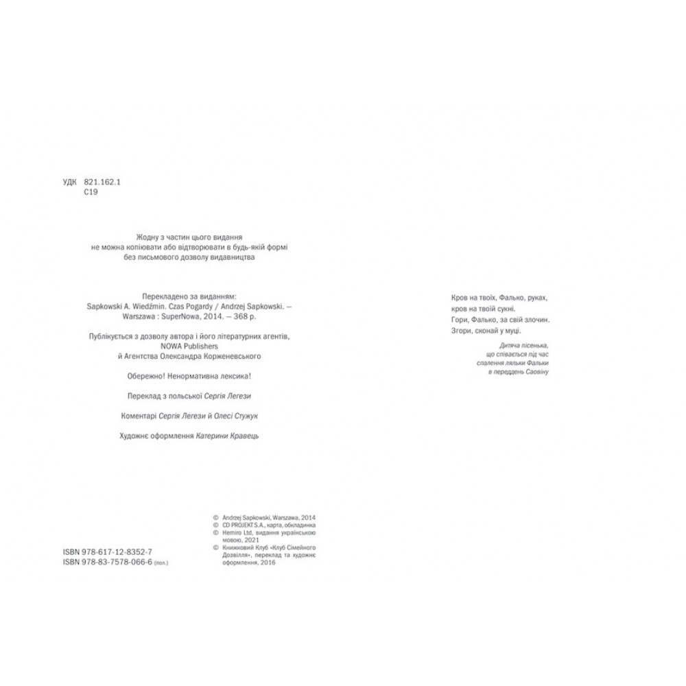 Згідно з давнім ельфійським пророцтвом, Цірі, Дитя Старшої Крові, мала змінити долю світу. Але поки зеленоока спадкоємиця трону Цінтри прямує під захистом своїх названих батьків до чарівницького острову Танедд, світ уже невпізнавано змінився. Усюди, в усіх серцях війна, ненависть і погорда. Для відьмака Ґеральта настав час заради порятунку Цірі обирати, на чиєму він боці.